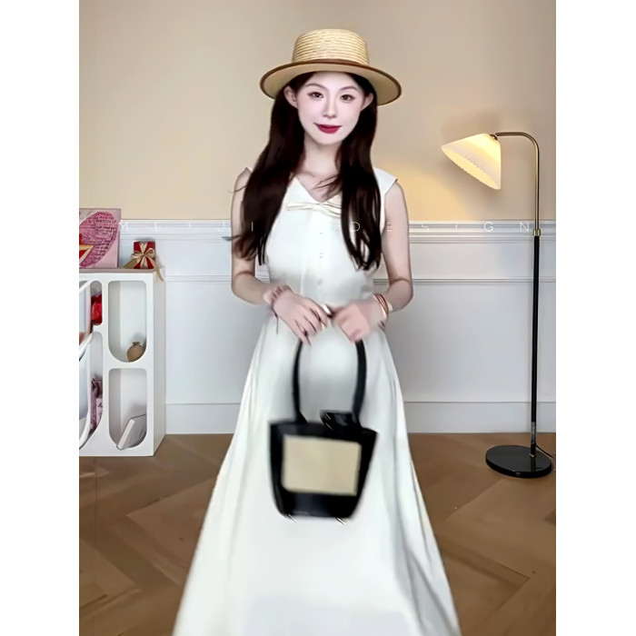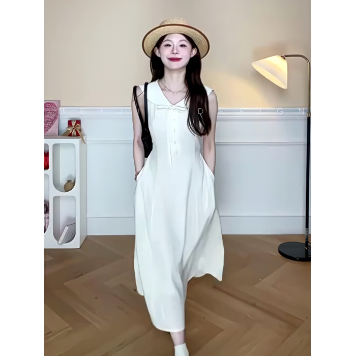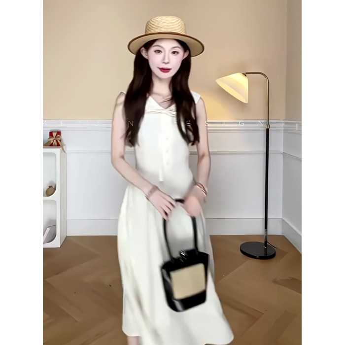 韓系純色蝴蝶結系帶連衣裙修身顯瘦設計感小衆氣質減齡中長款裙子