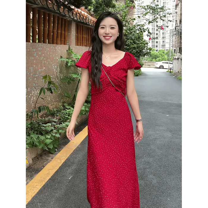 法式荷葉邊紅色波點泡泡袖連衣裙女2025夏季新款設計感小衆長裙子