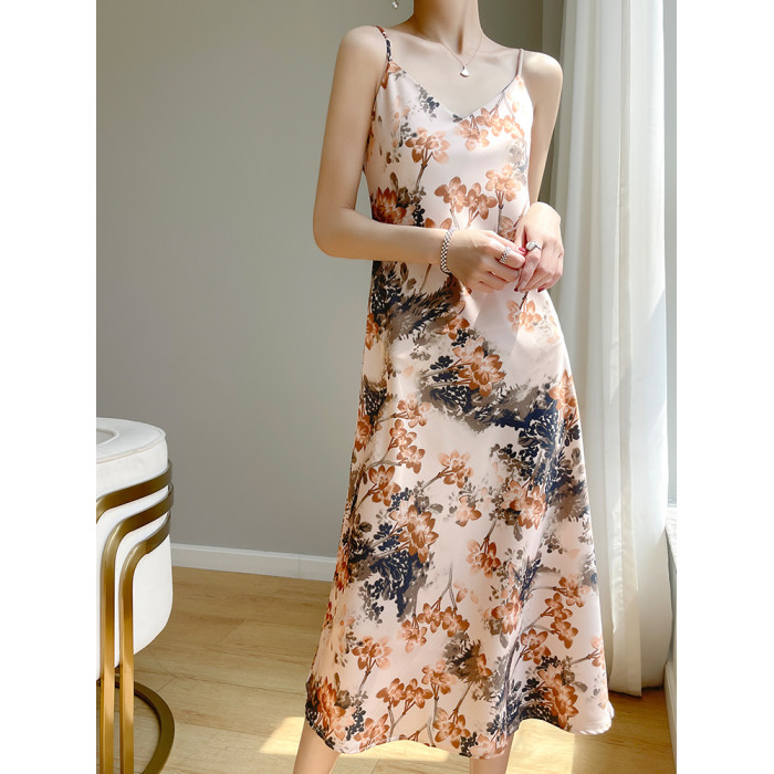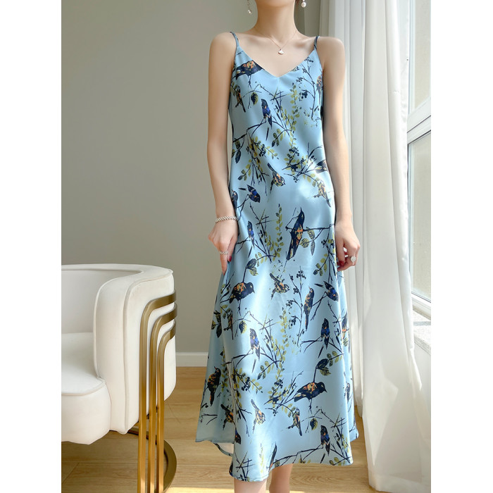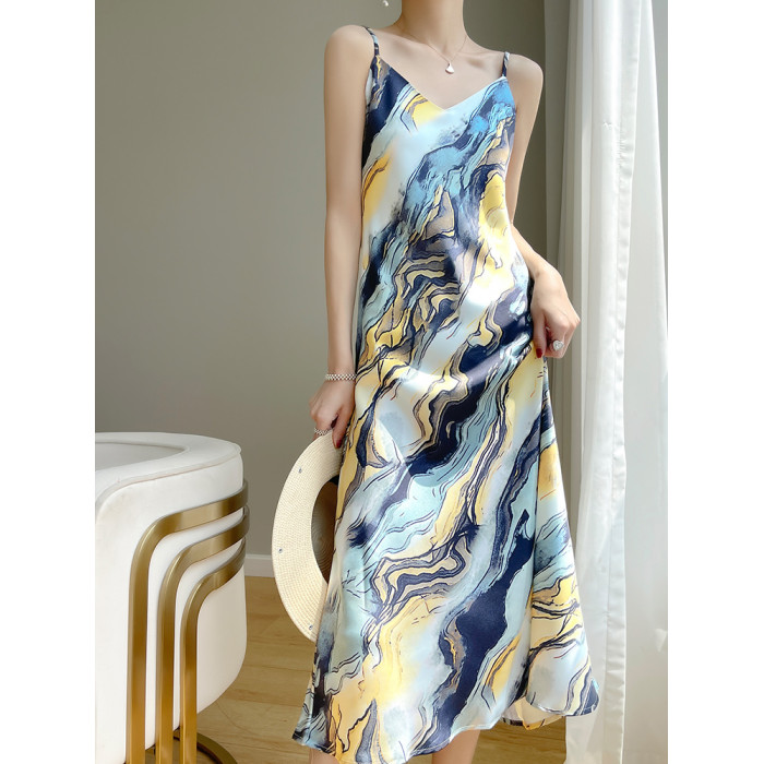 法式藍色油畫長裙沙灘裙碎花吊帶連衣裙女夏2023新款高級感裙子