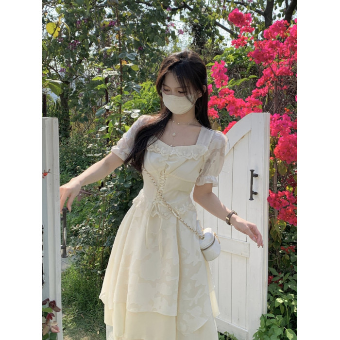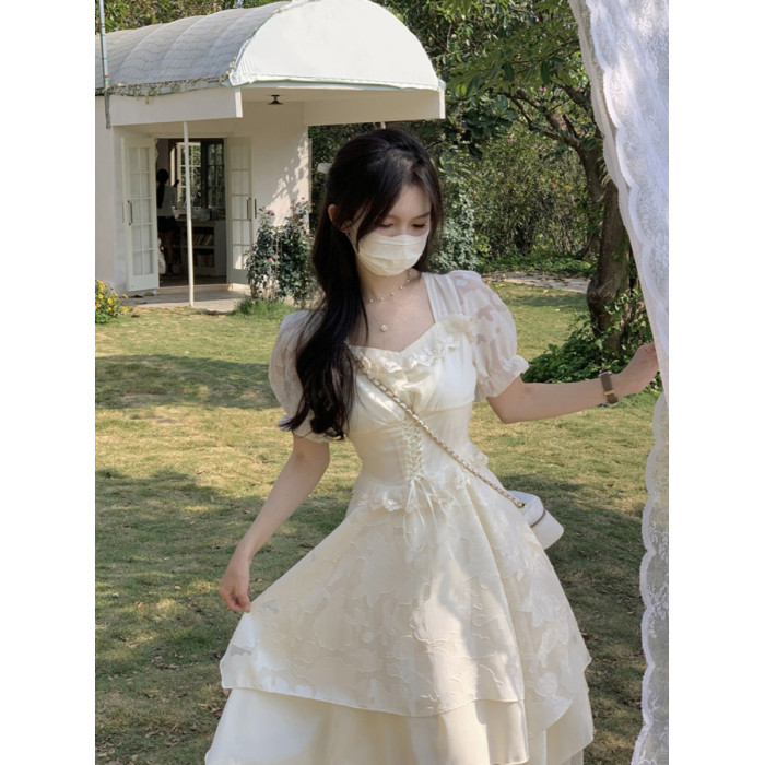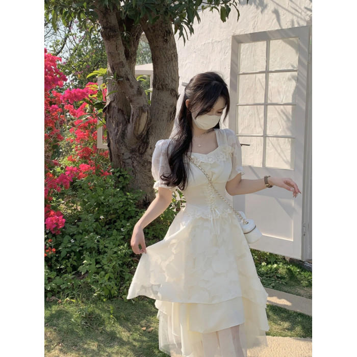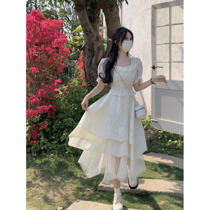 夏季法式初戀清純奶甜裙子蓬蓬裙收腰連衣裙女不規則荷葉邊公主裙