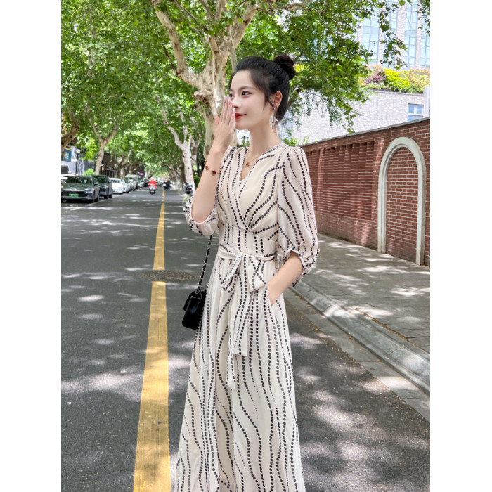 法式條紋連衣裙女2025年新款夏季韓版小個子設計感收腰顯瘦過膝裙