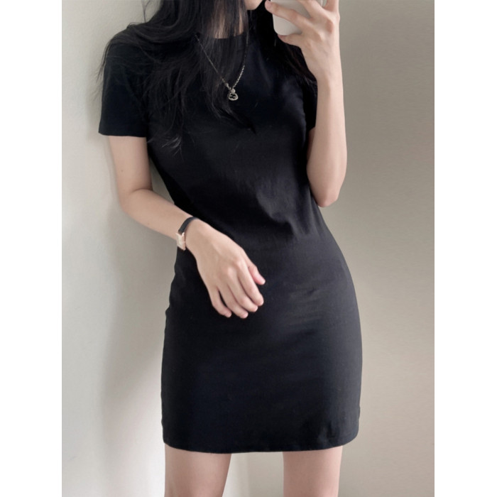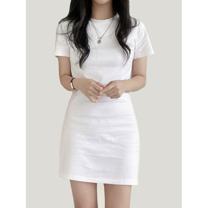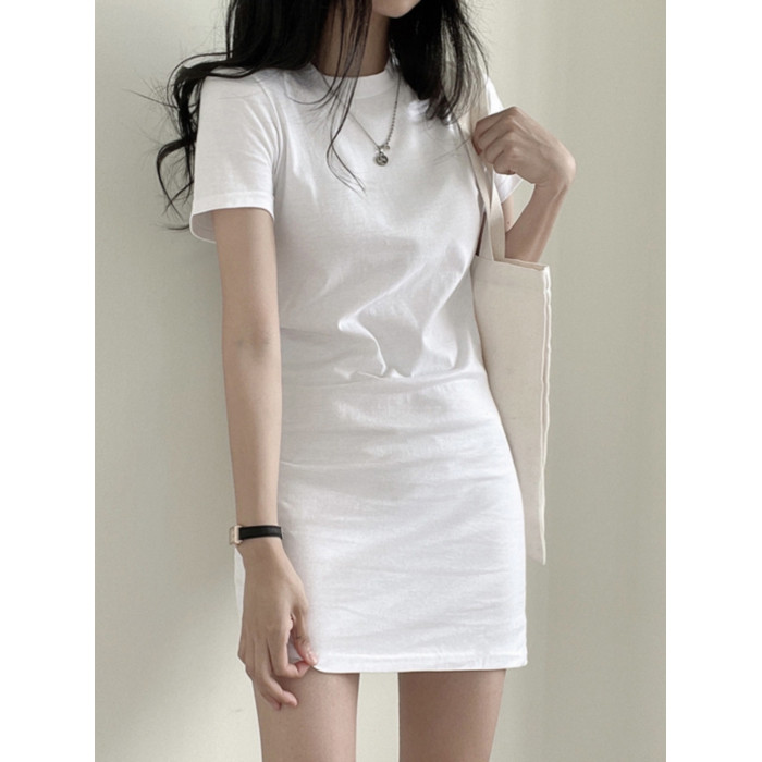 白色圓領t恤連衣裙女短袖2025夏新款修身顯瘦中長款百搭打底裙子