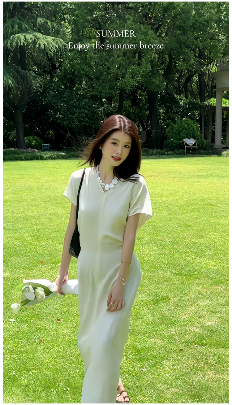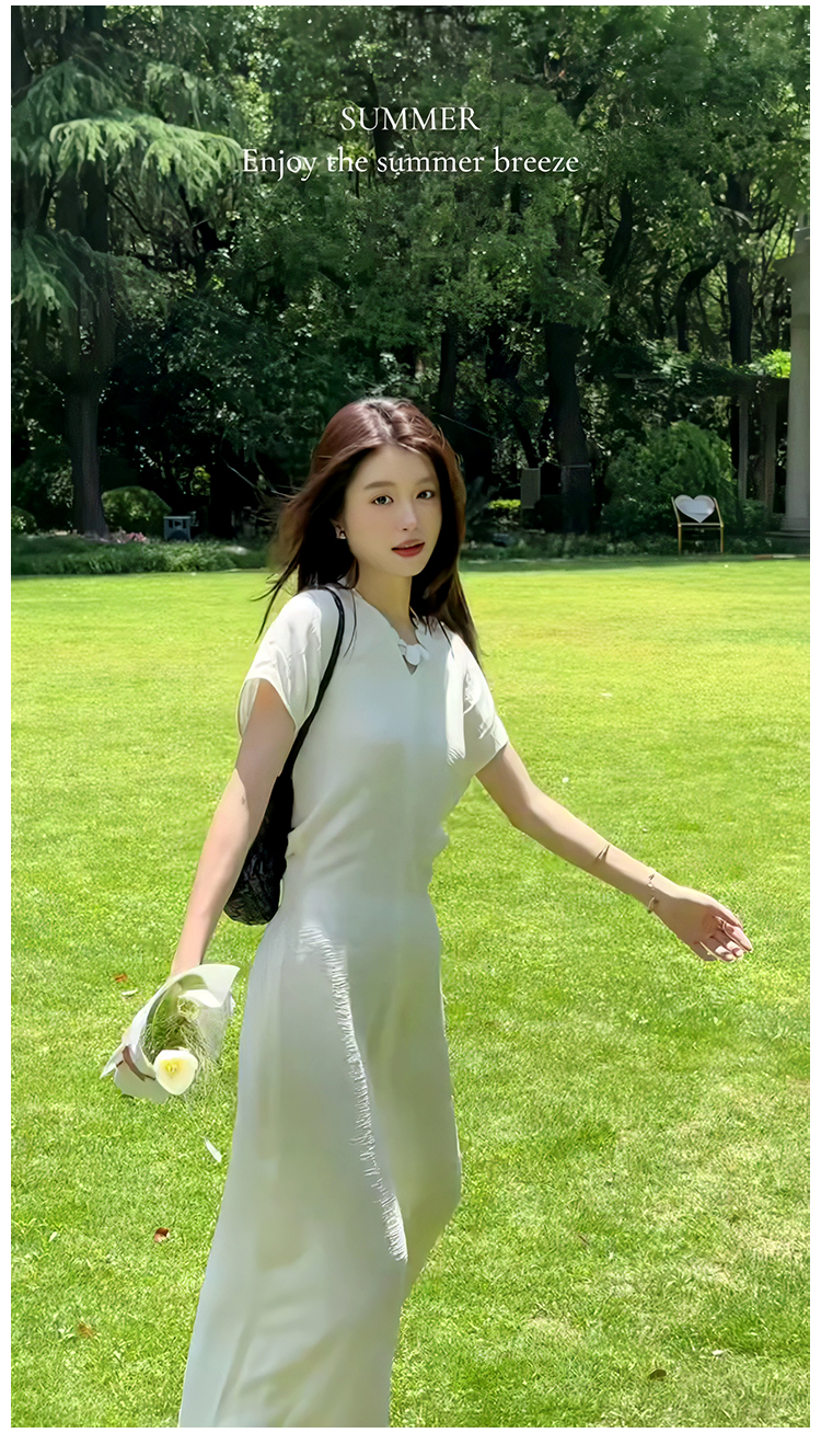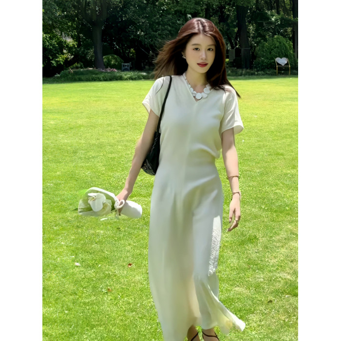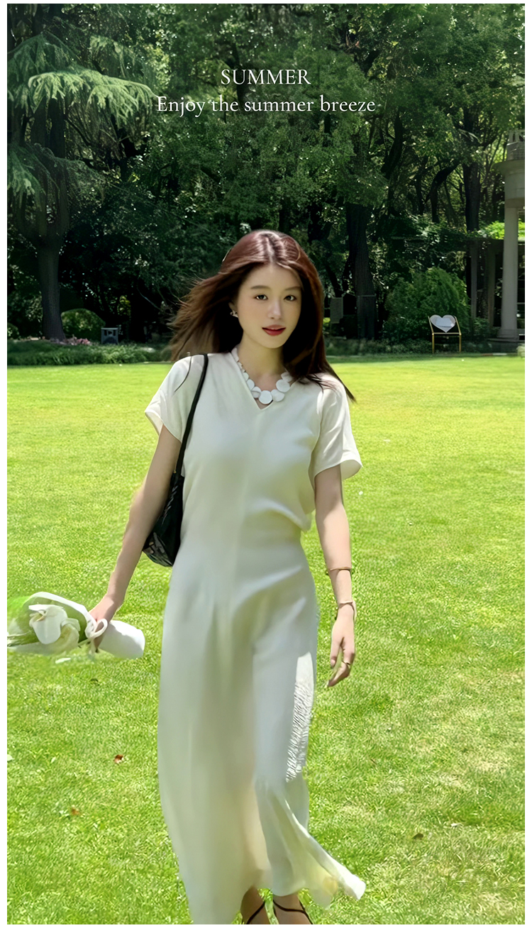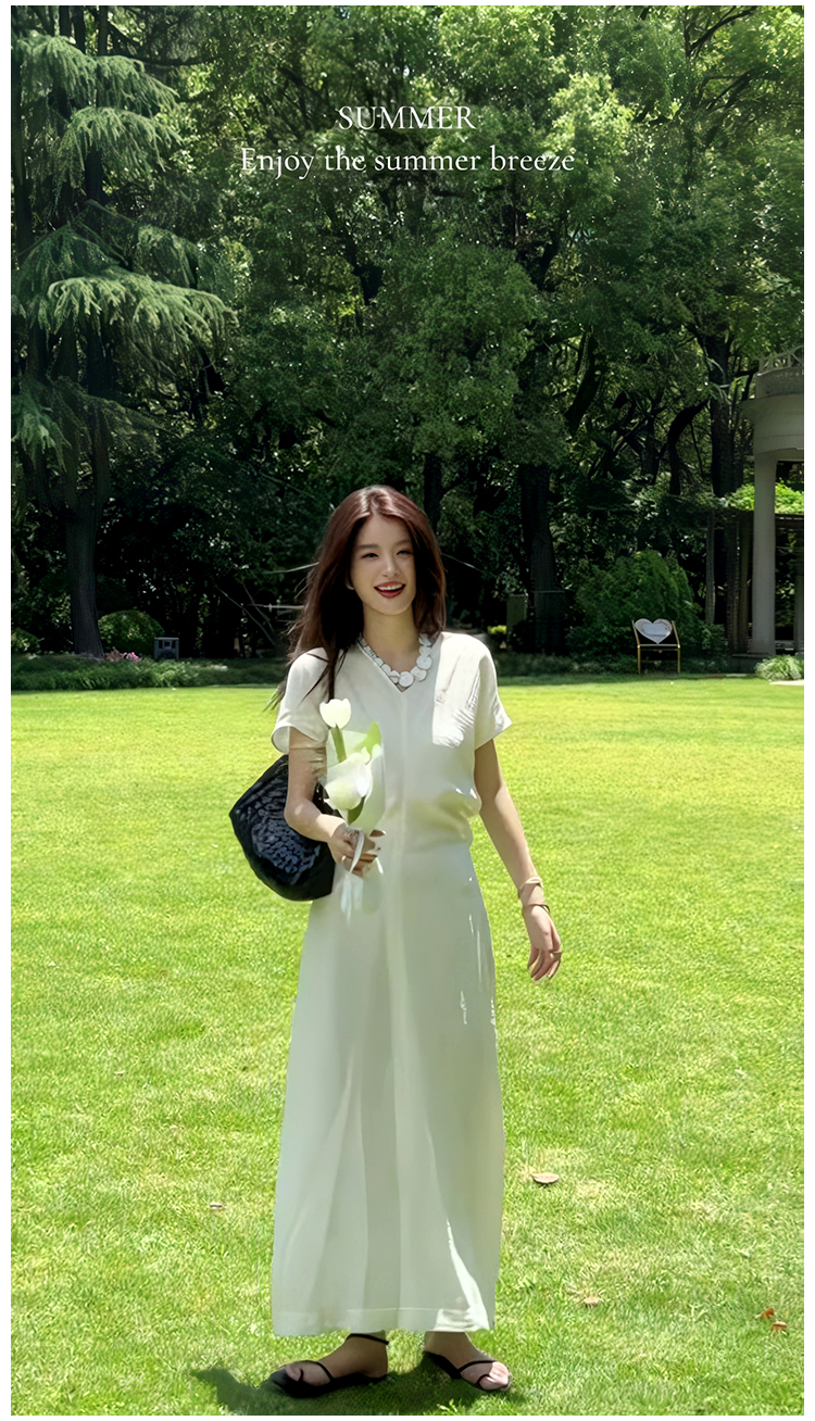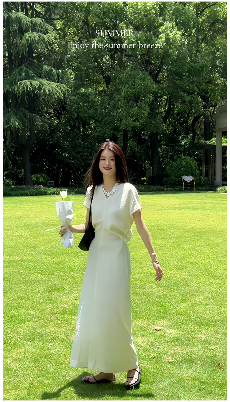 法式松弛感氣質收腰顯瘦連衣裙女2025夏新款短袖高級感優雅長裙子