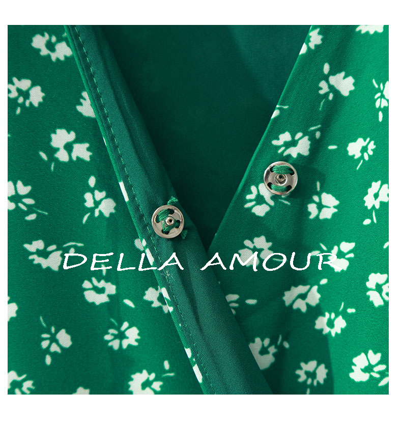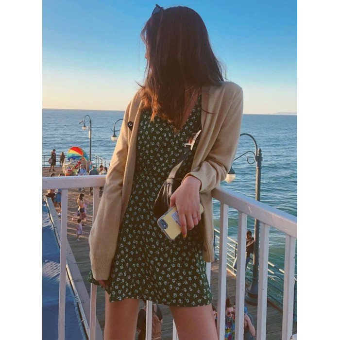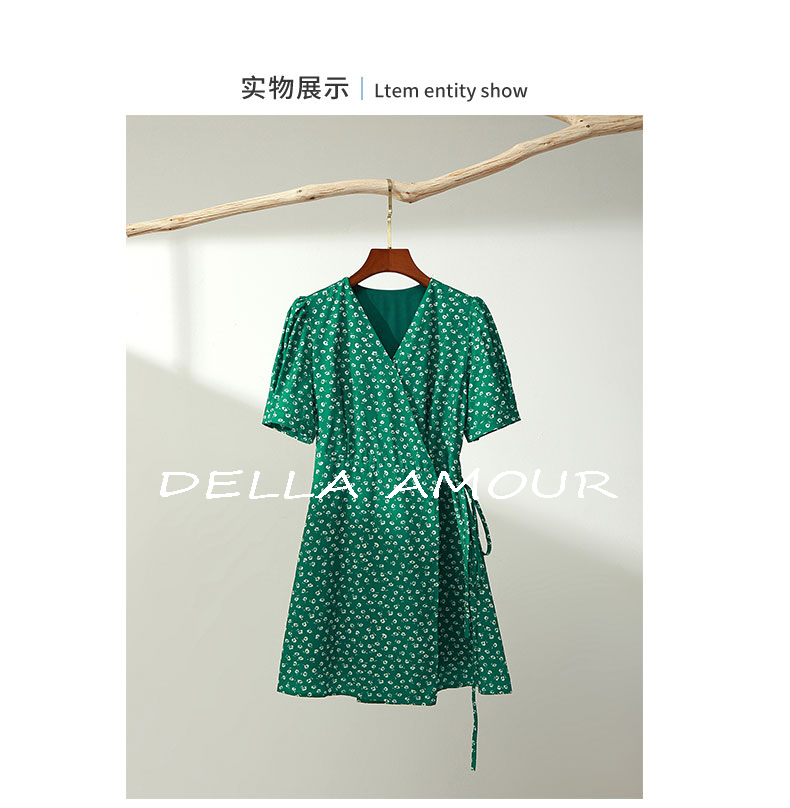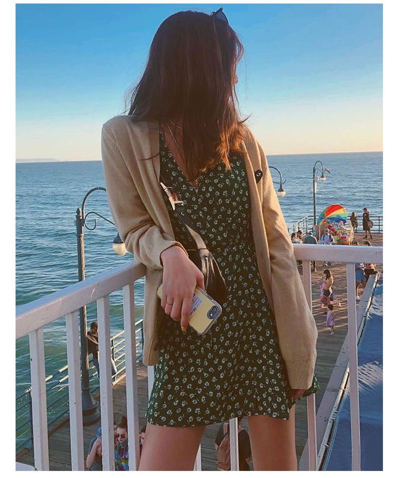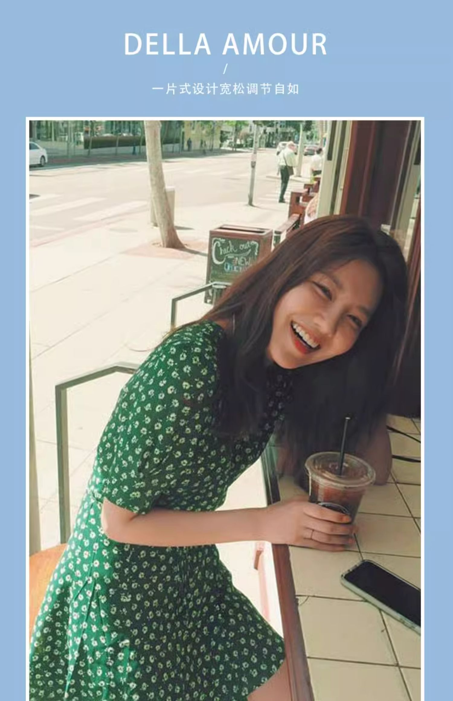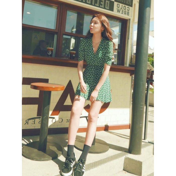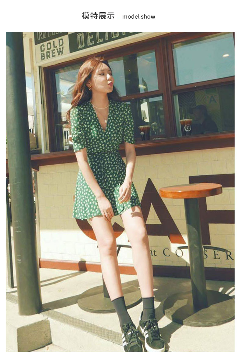 崔秀英同款綠色一片式法式碎花連衣裙V領茶歇桔梗海邊沙灘度假裙