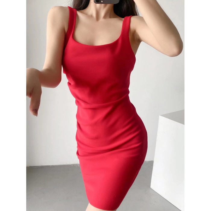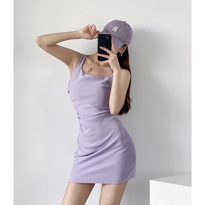 歐美2023夏季新品修身顯瘦法式方領吊帶連衣裙高腰褶皺背心裙短裙