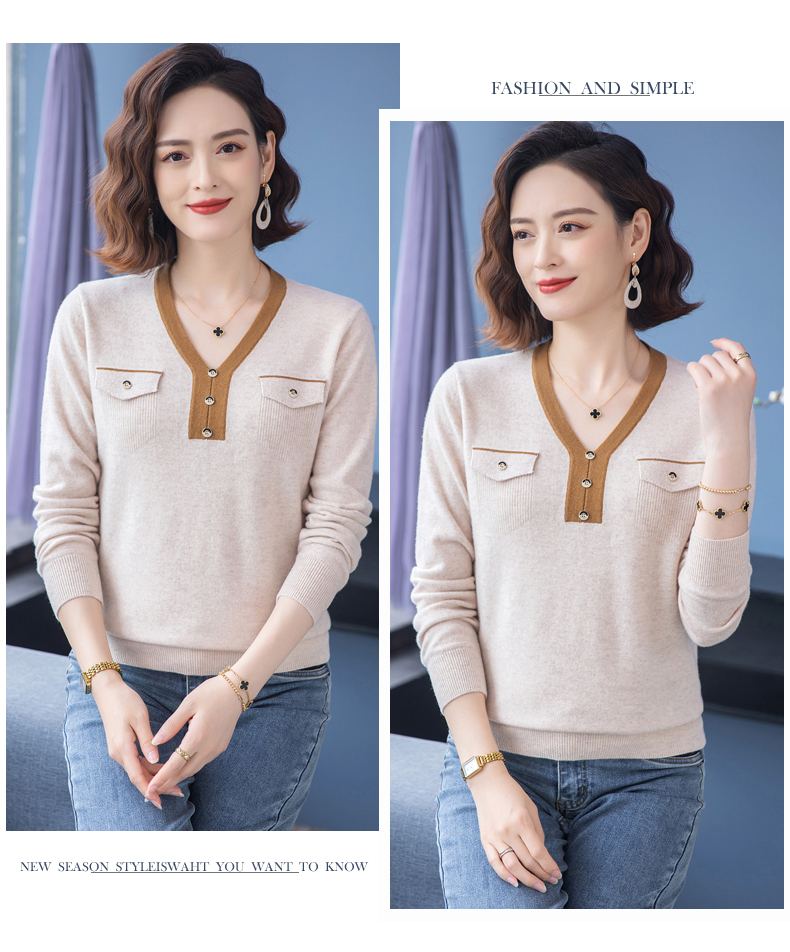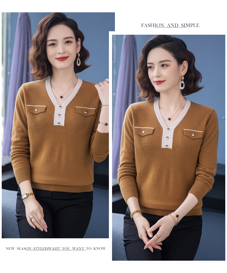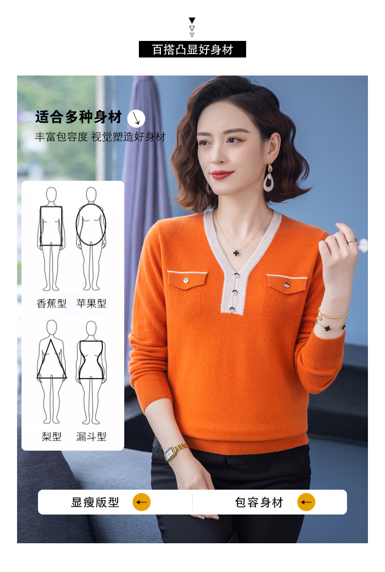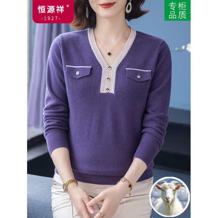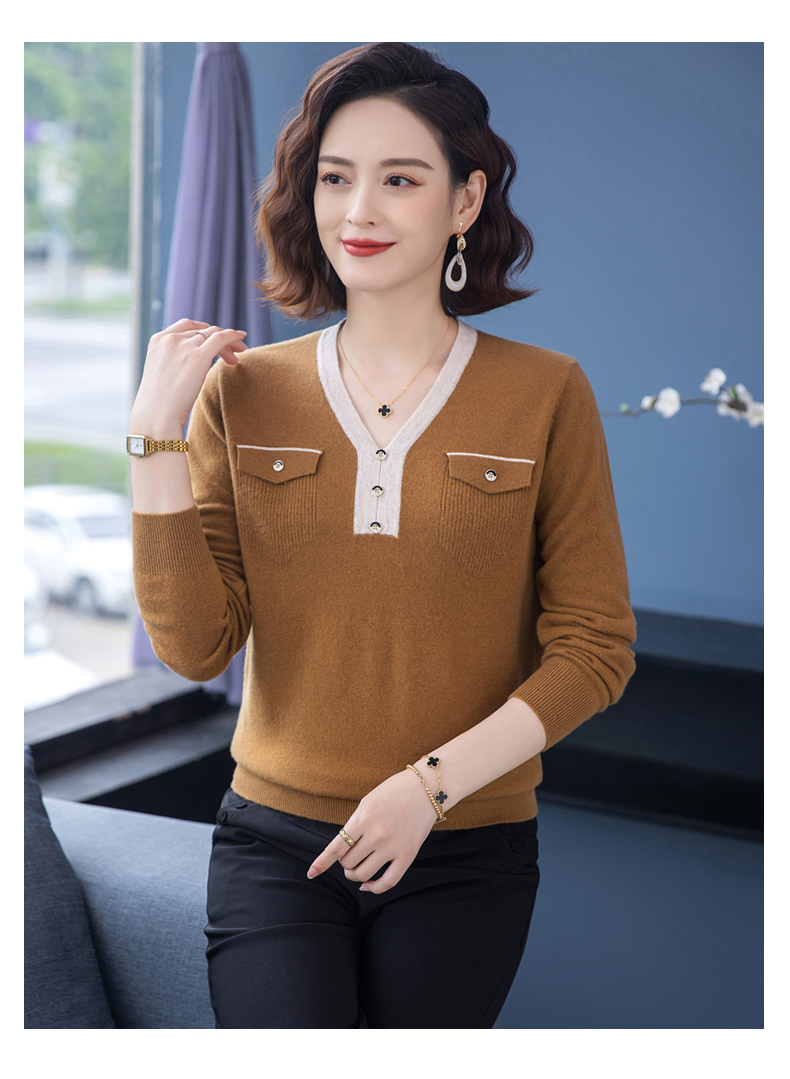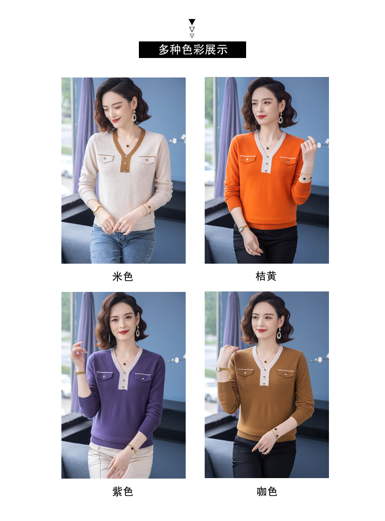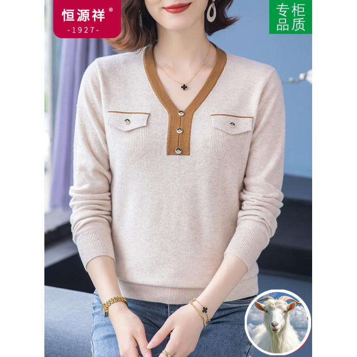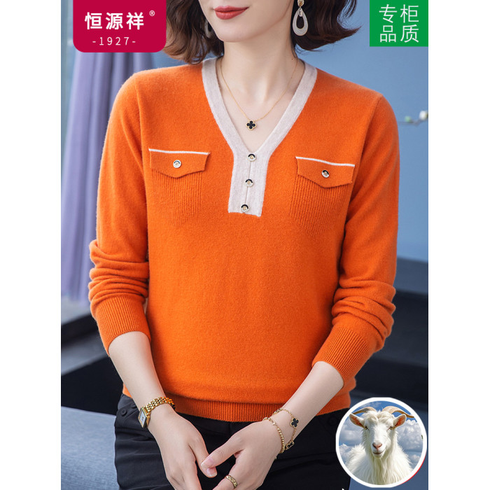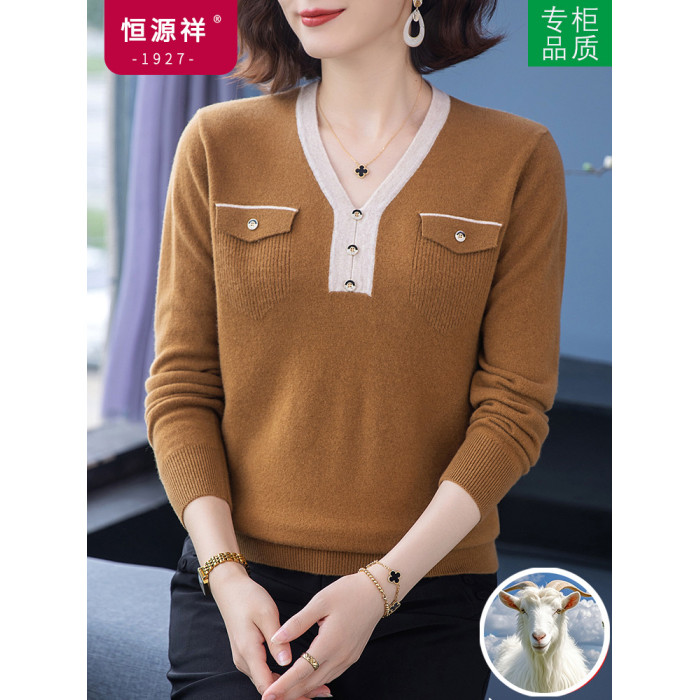 恒源祥羊毛衫女100純羊毛秋冬季新品V領短款媽媽裝毛衣內搭打底衫
