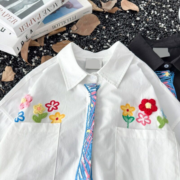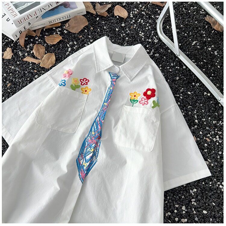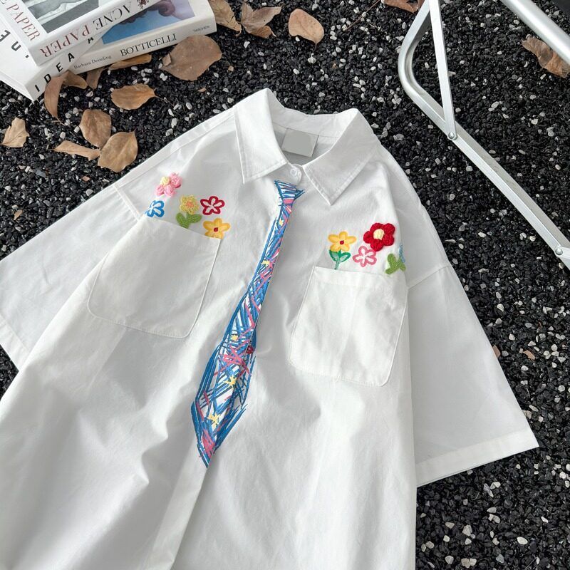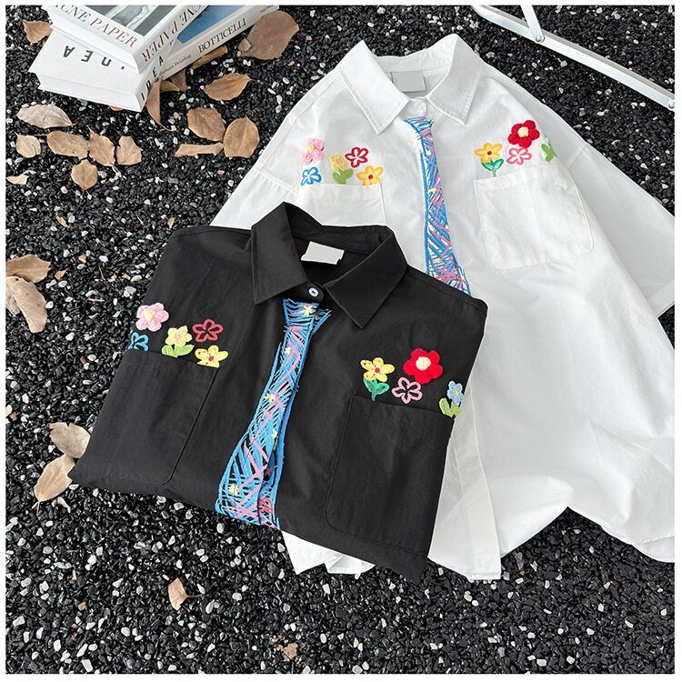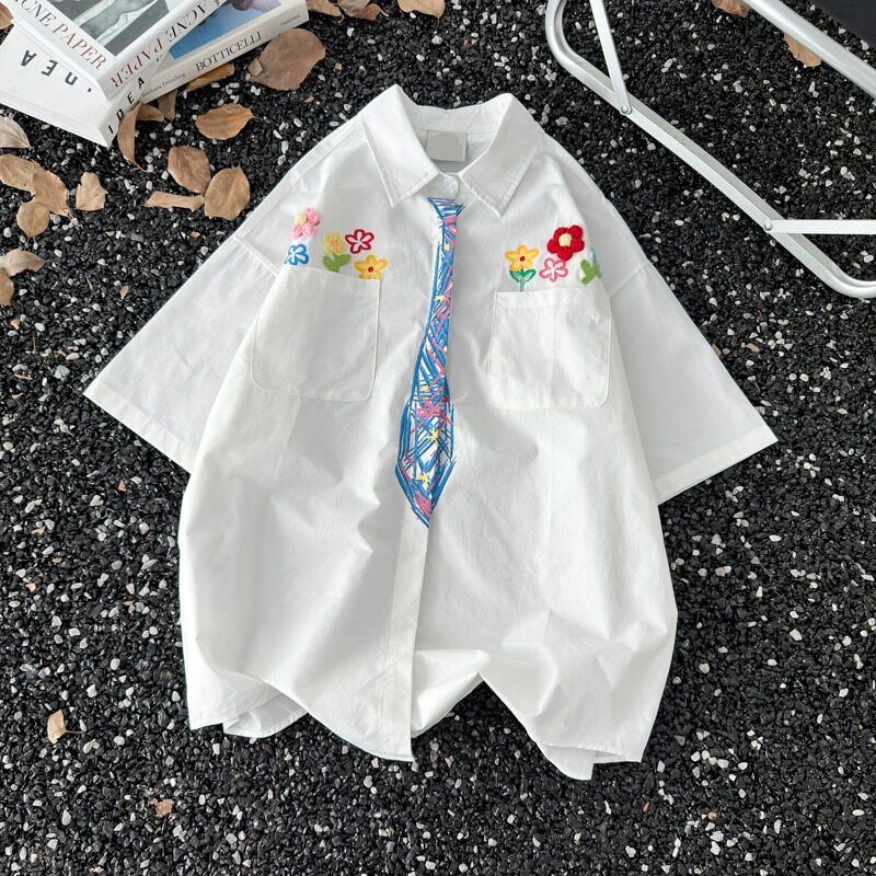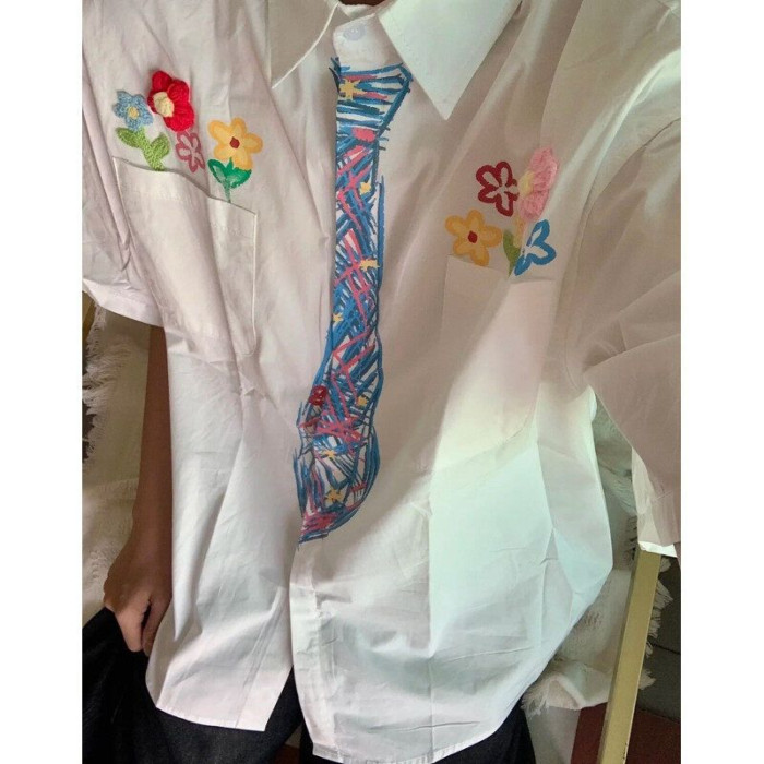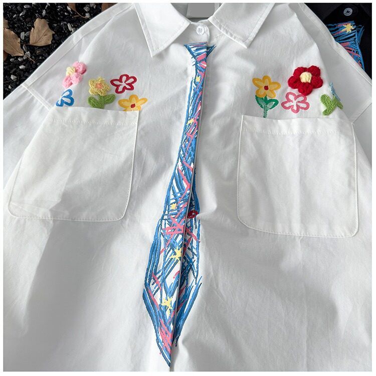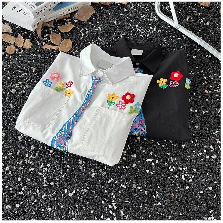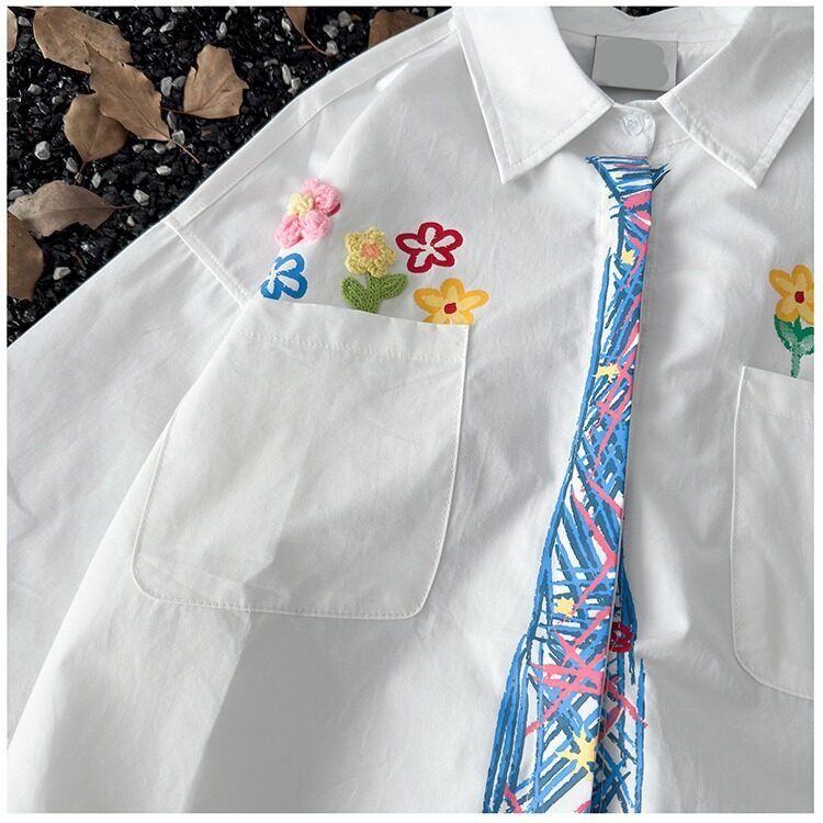 日系文藝小清新花朵刺綉全棉白襯衫女春秋韓範秋打底衫休閒上衣潮