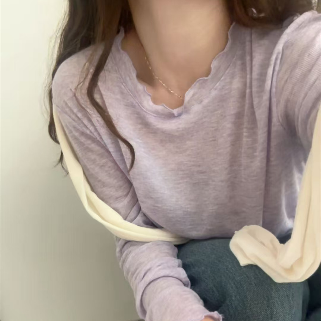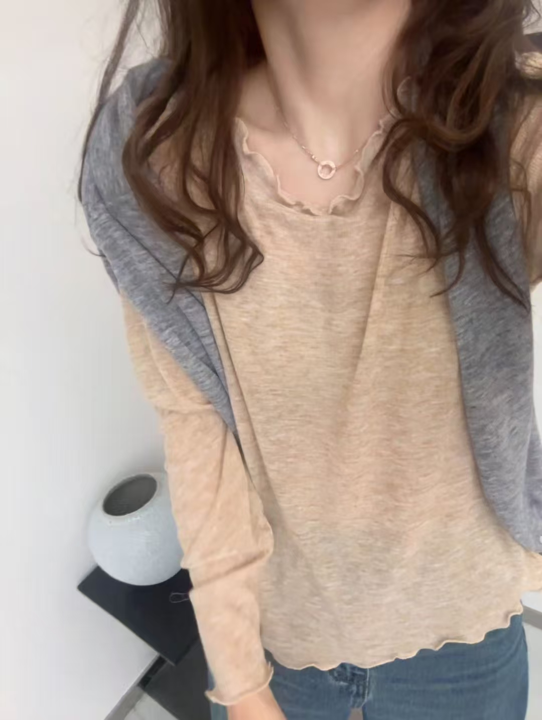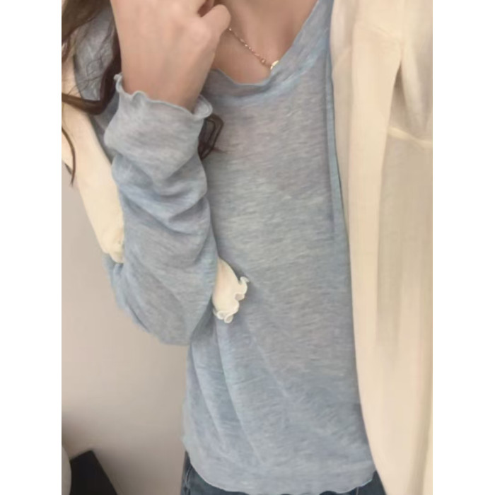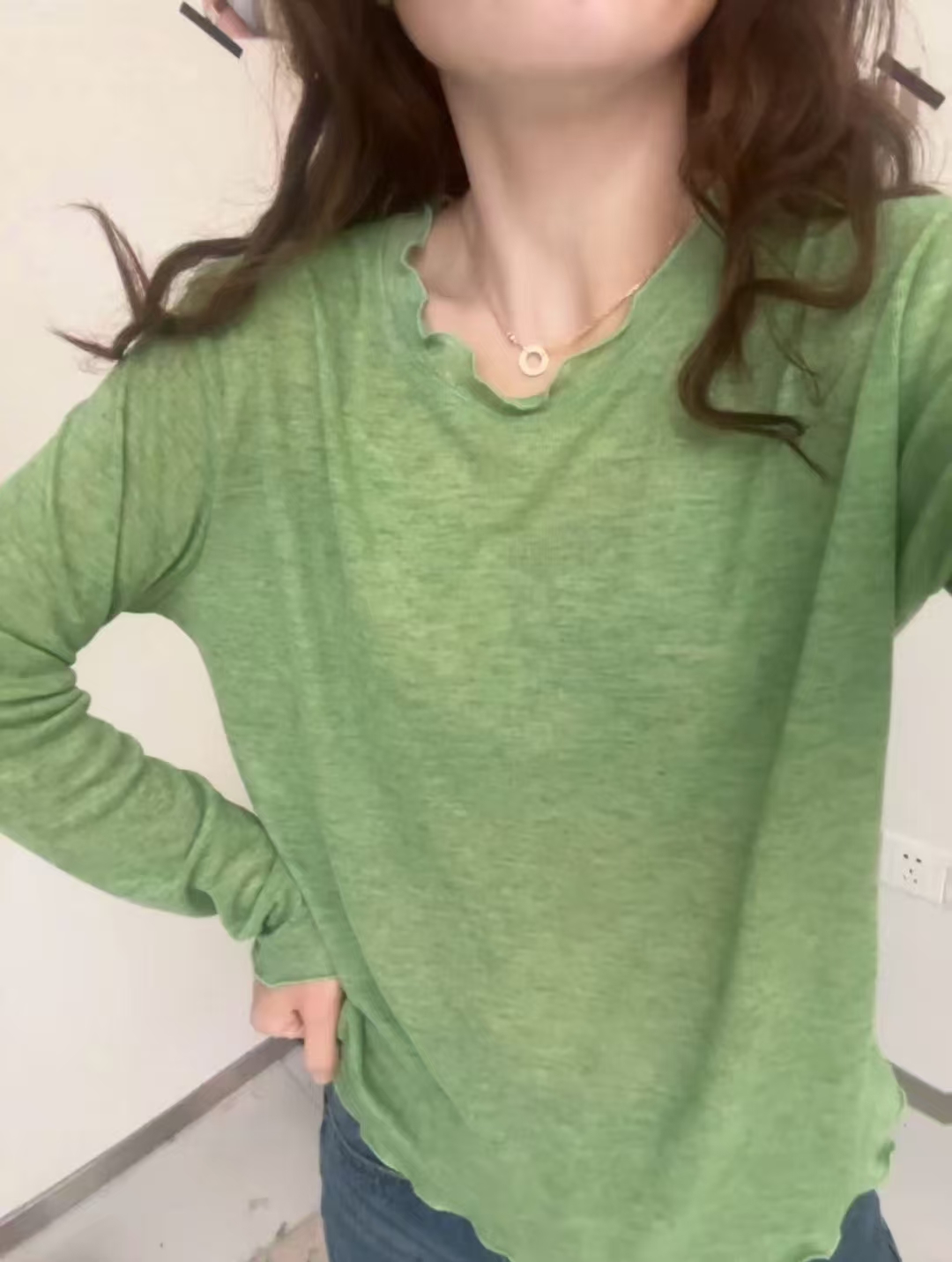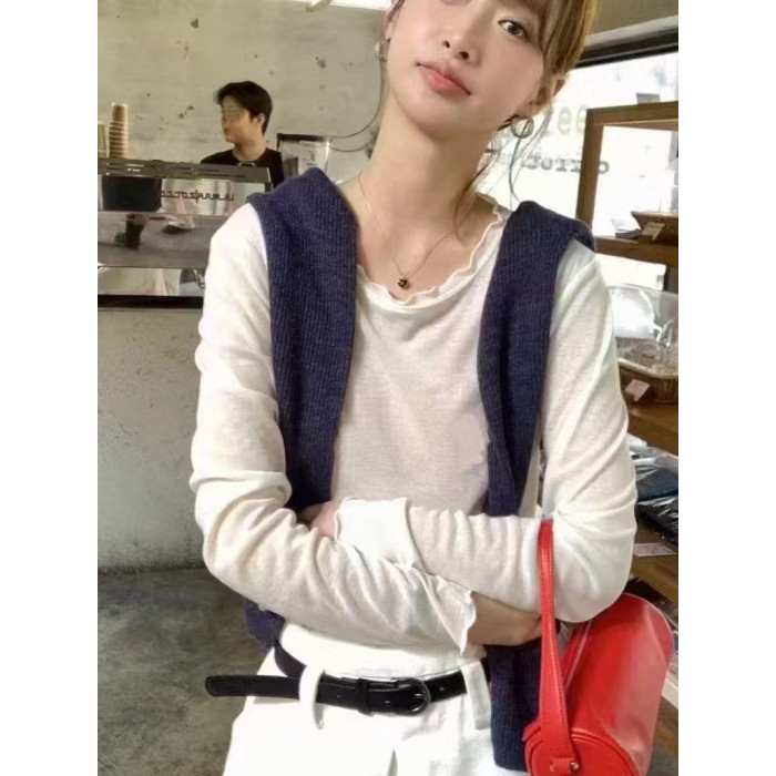2025秋季韓版百搭木耳邊圓領長袖水溶羊毛打底衫女顯瘦內搭上衣