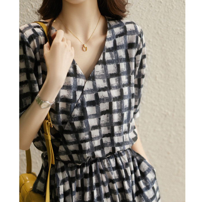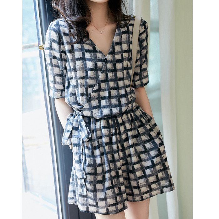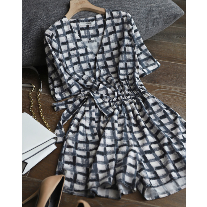 V領收腰顯瘦連體褲女夏季薄款2025年新款時尚格紋水墨氣質連衣裙