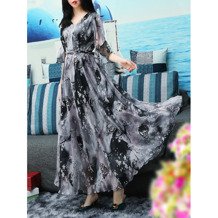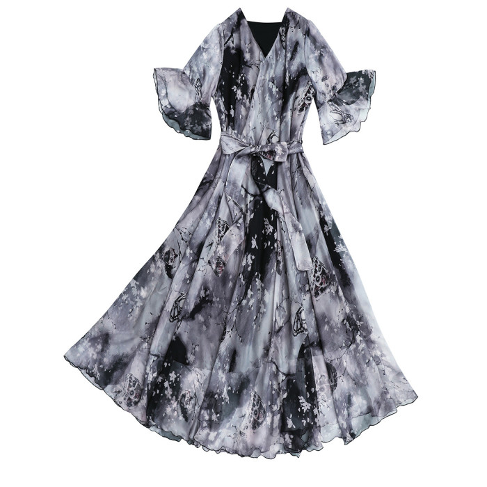 夏季新款雪紡新中式連衣裙碎花胖mm大碼寬松顯瘦國風長裙海邊度假