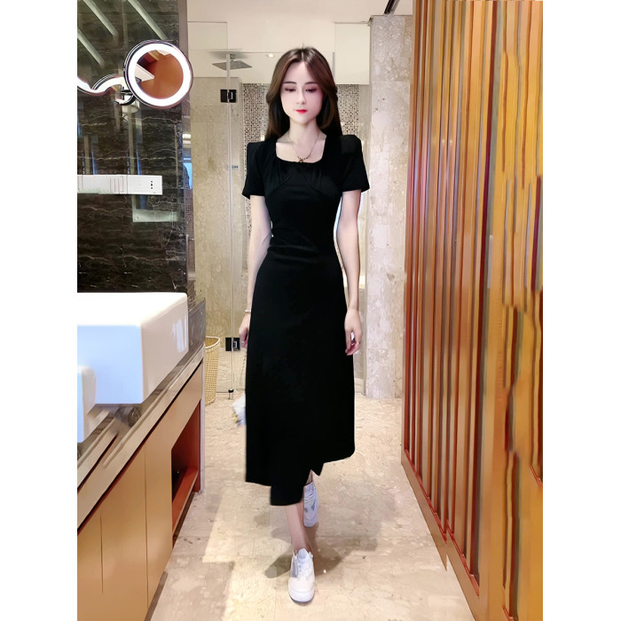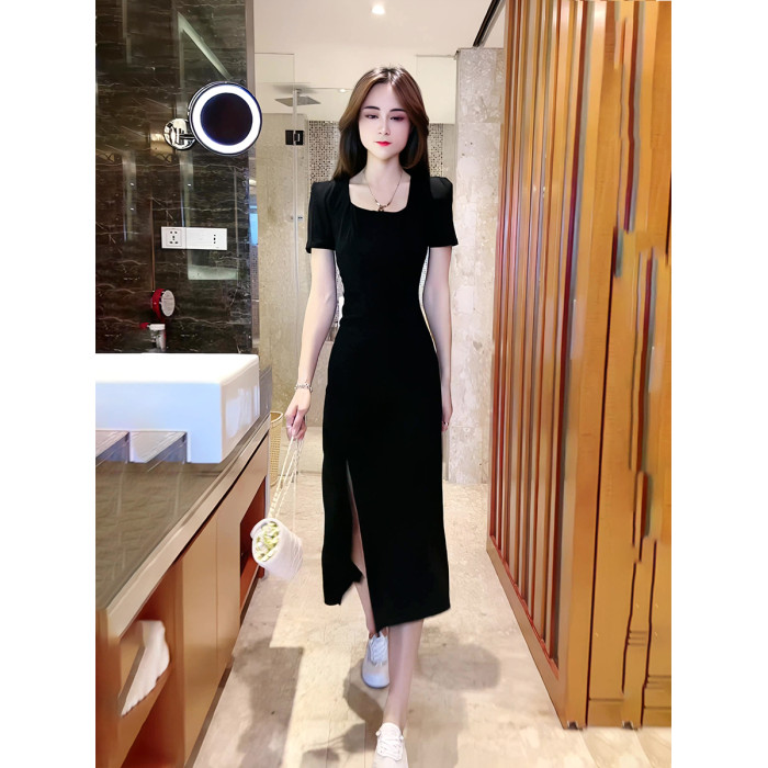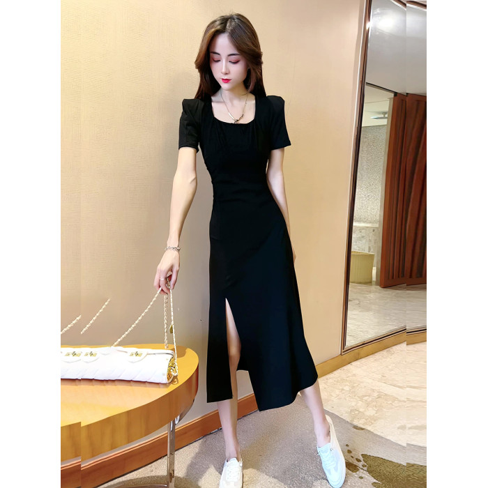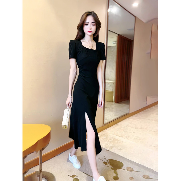 2025夏新款黑色連衣裙女收腰顯瘦氣質赫本風泡泡袖法式開叉長裙潮
