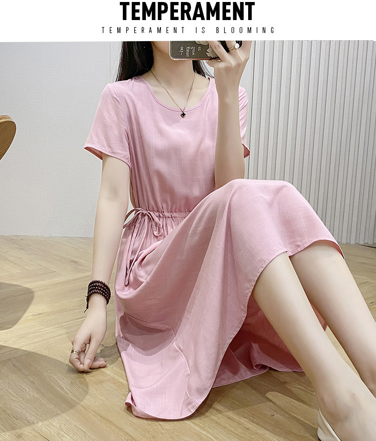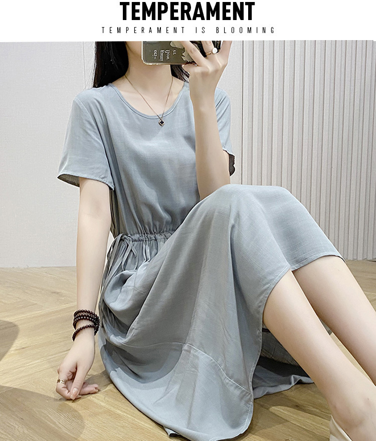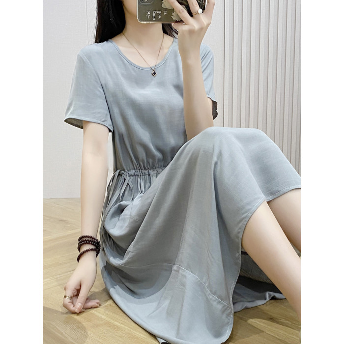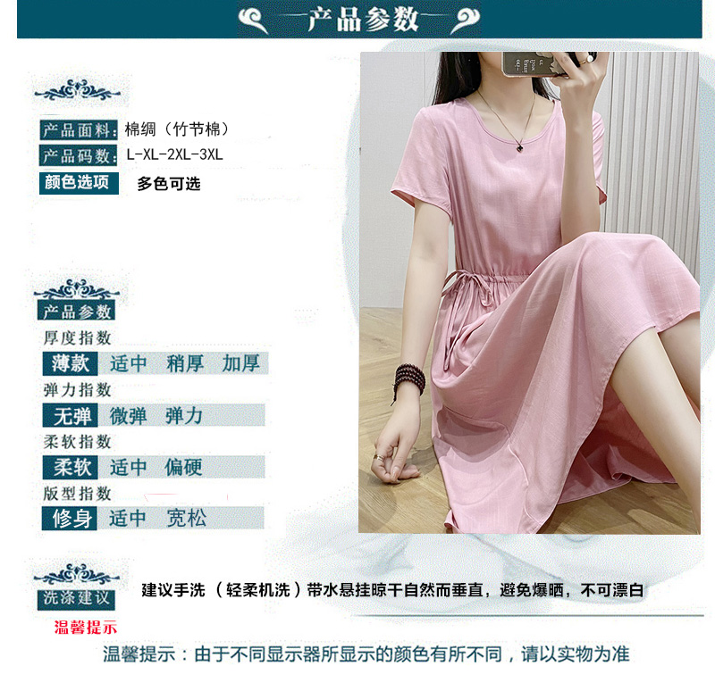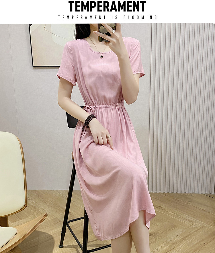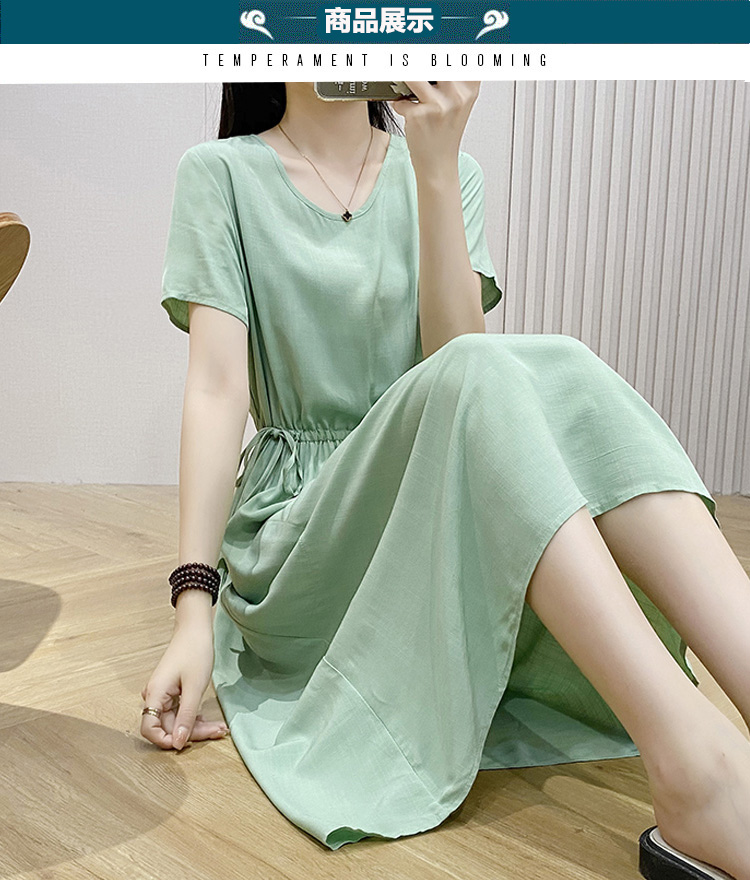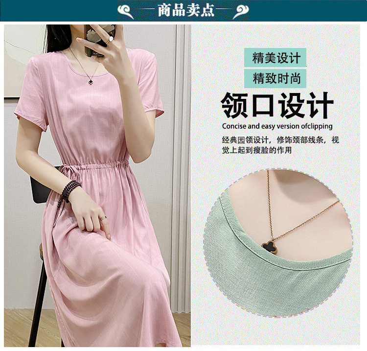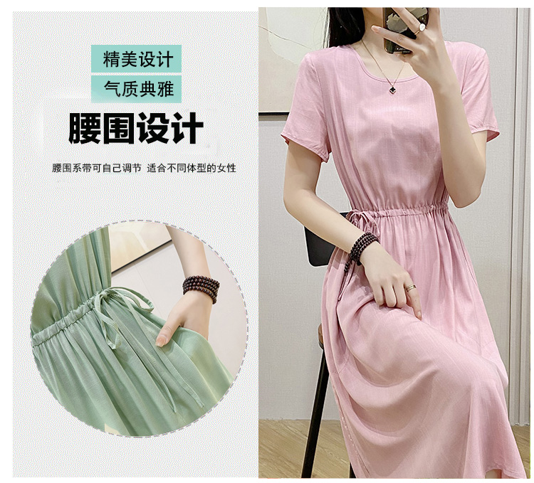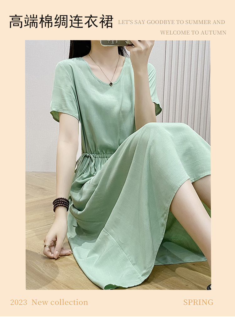 新款夏季竹節棉棉綢連衣裙女小個子純色收腰裙子人造棉媽媽中長裙