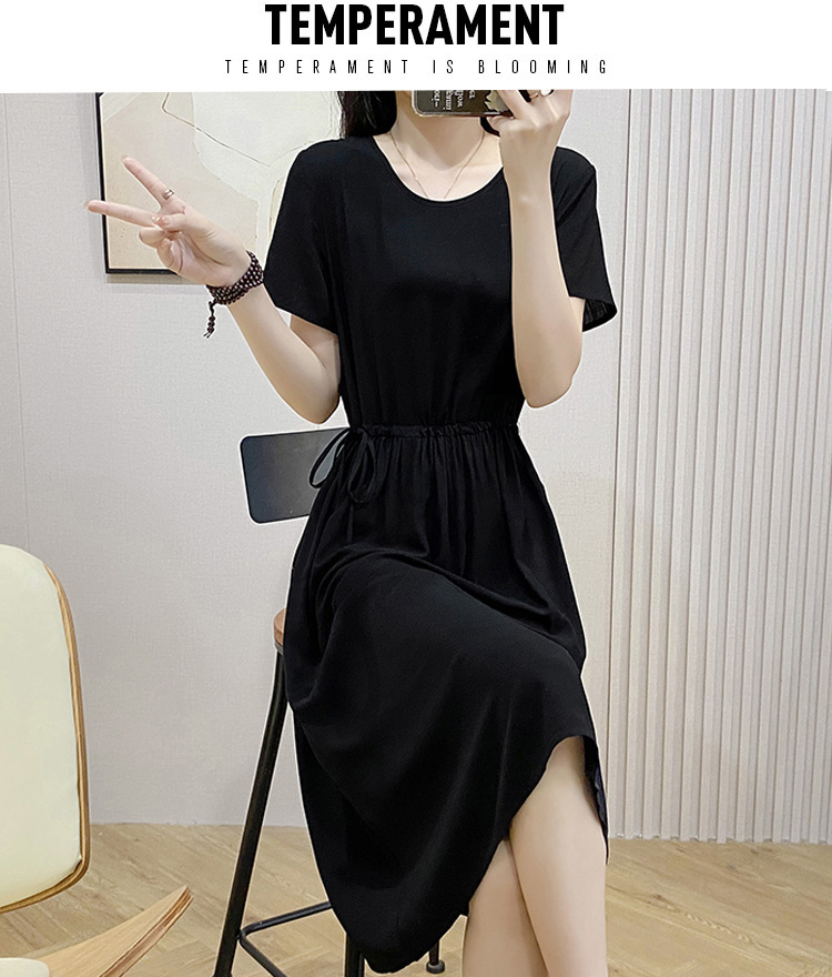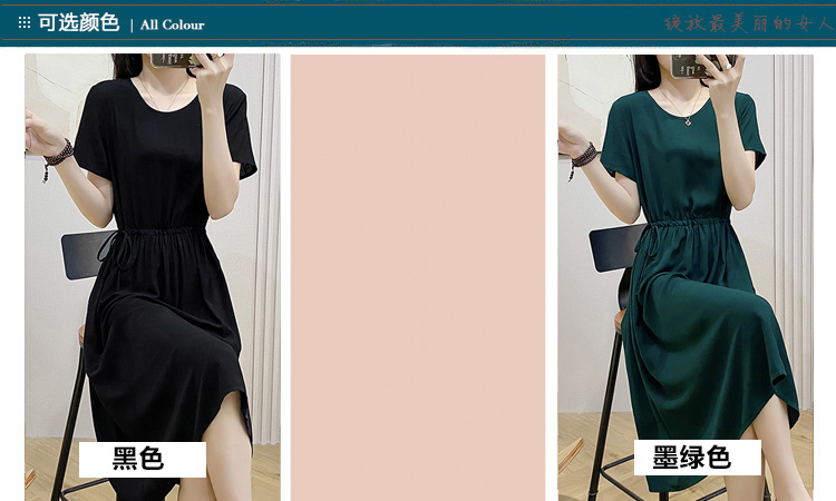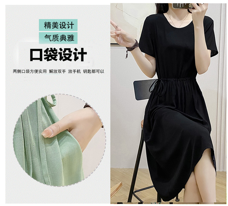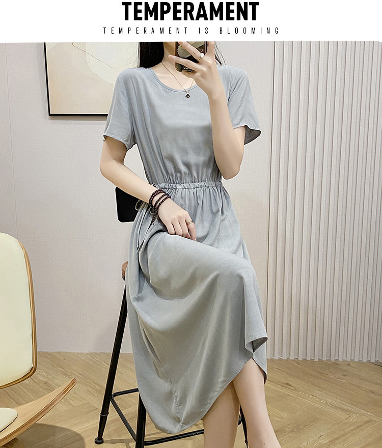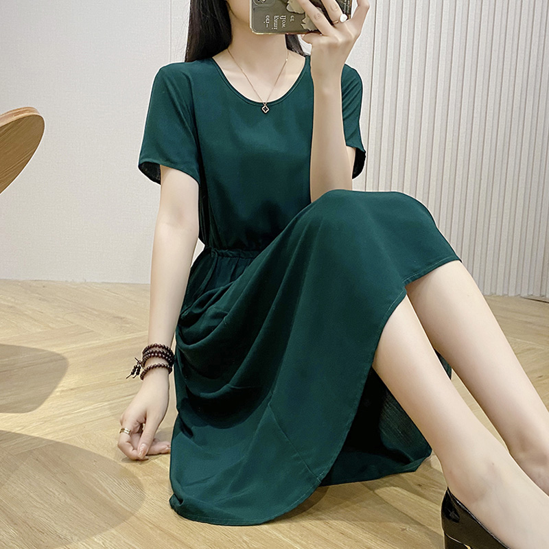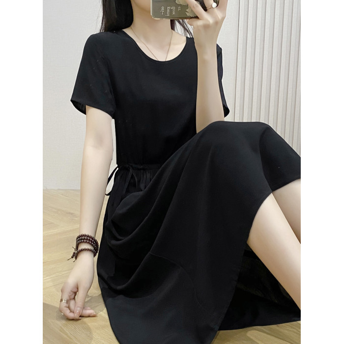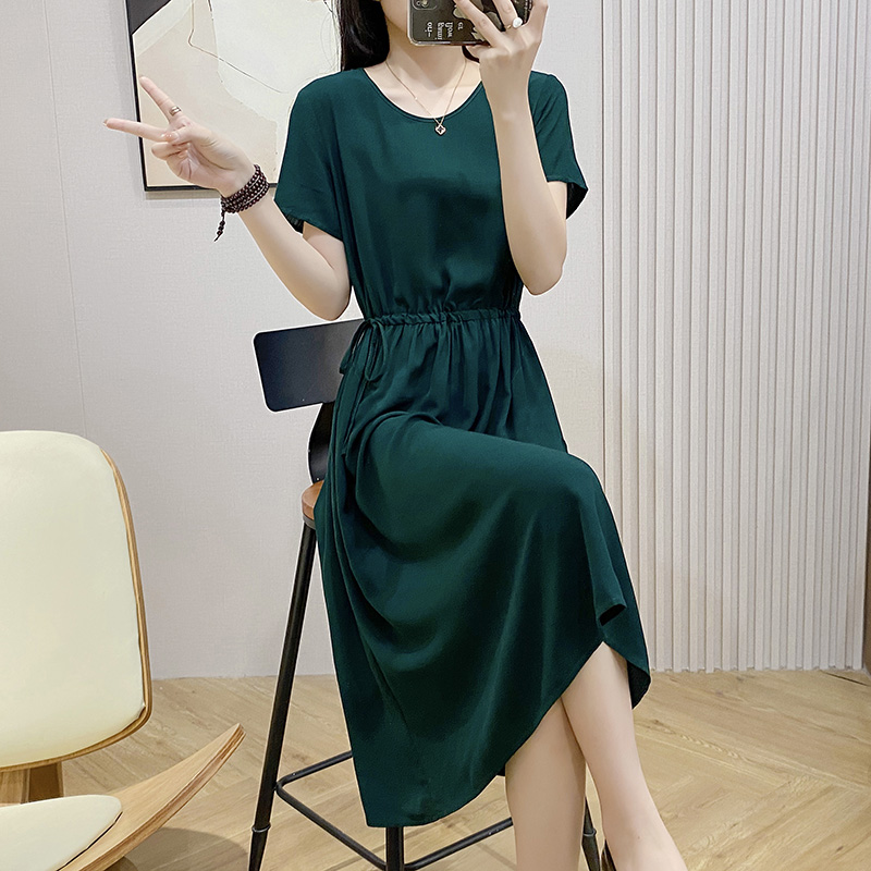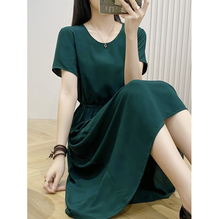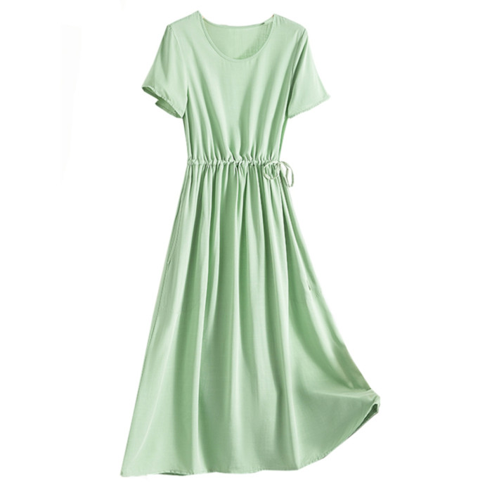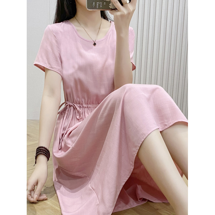新款夏季竹節棉棉綢連衣裙女小個子純色收腰裙子人造棉媽媽中長裙