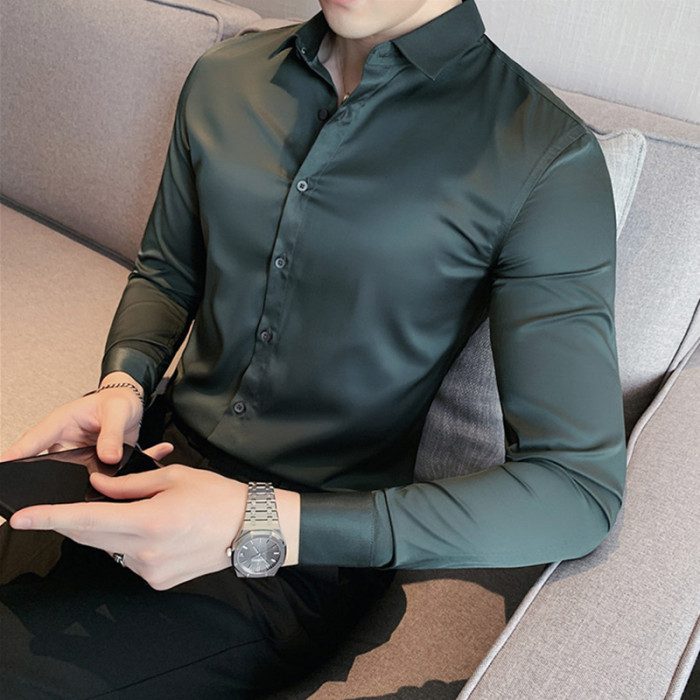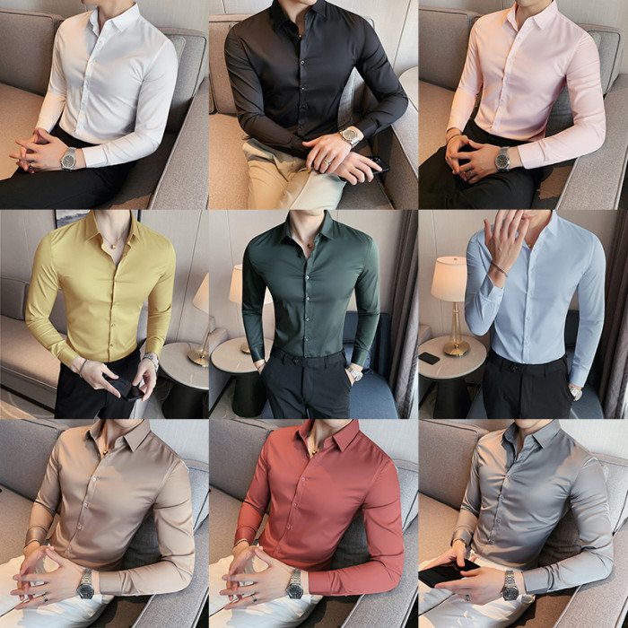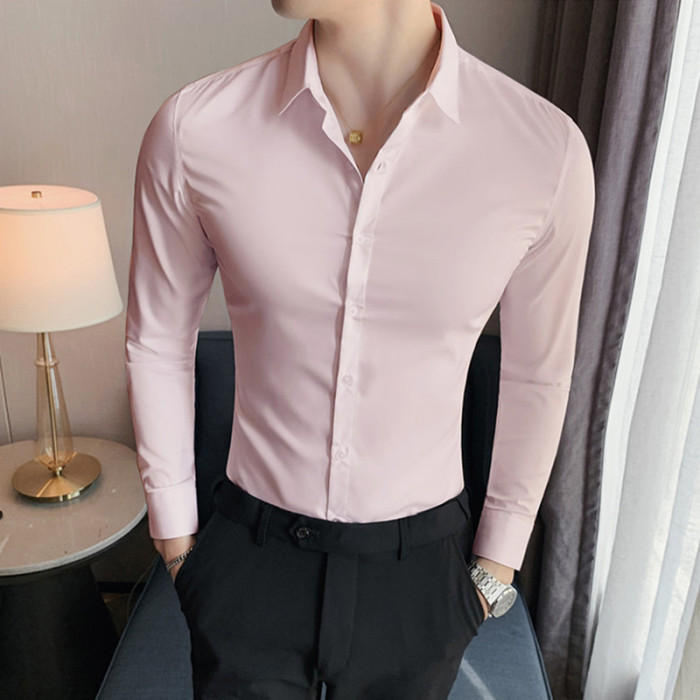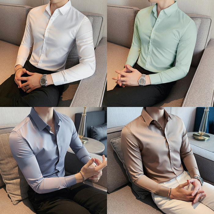 高級感冰絲白襯衫男長袖商務正裝修身潮牌痞帥襯衣西裝內搭打底衫
