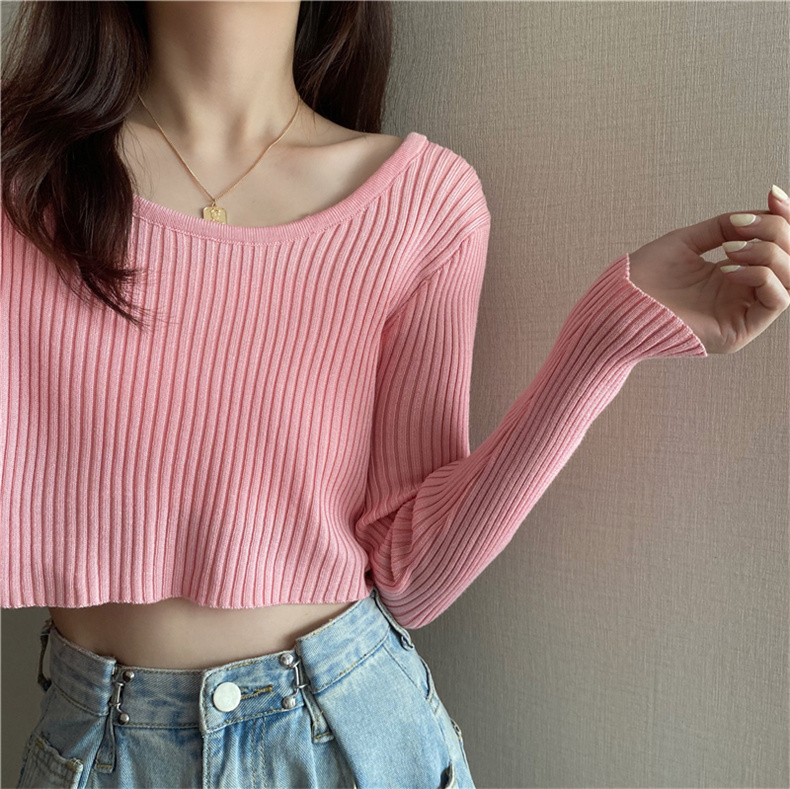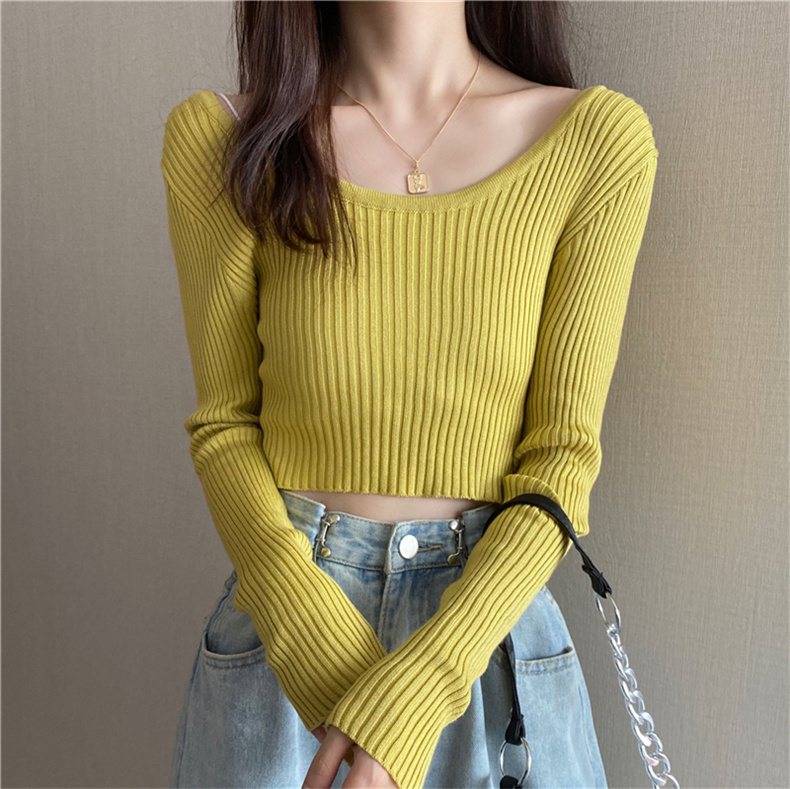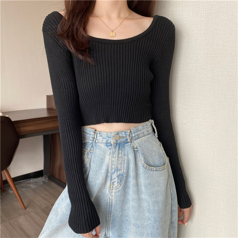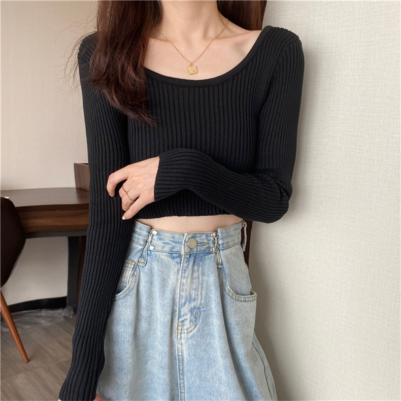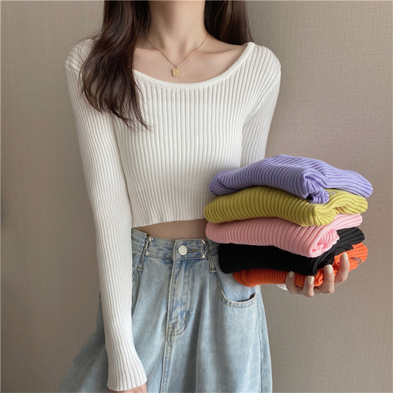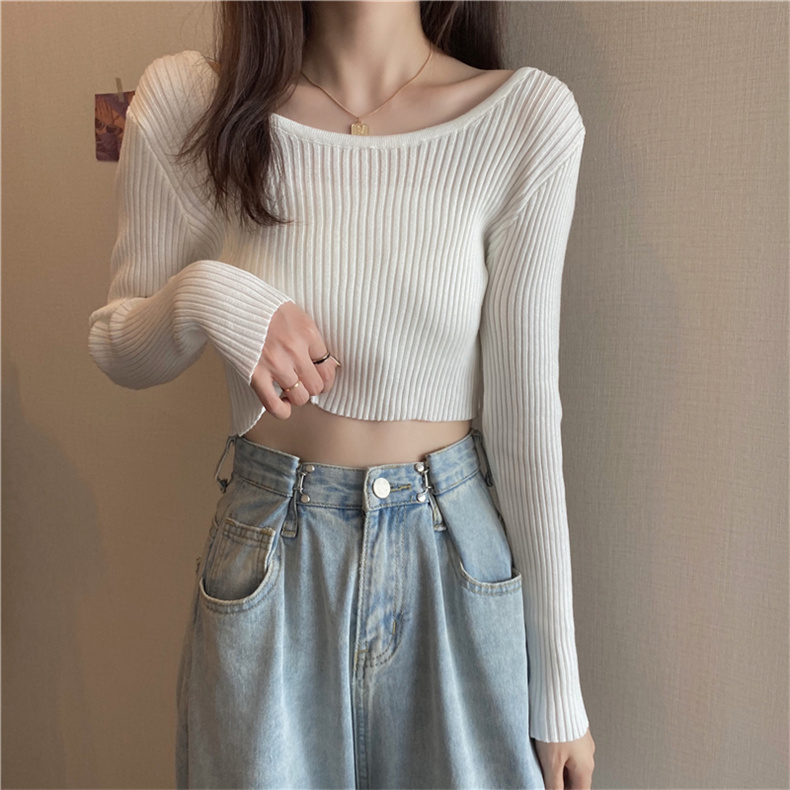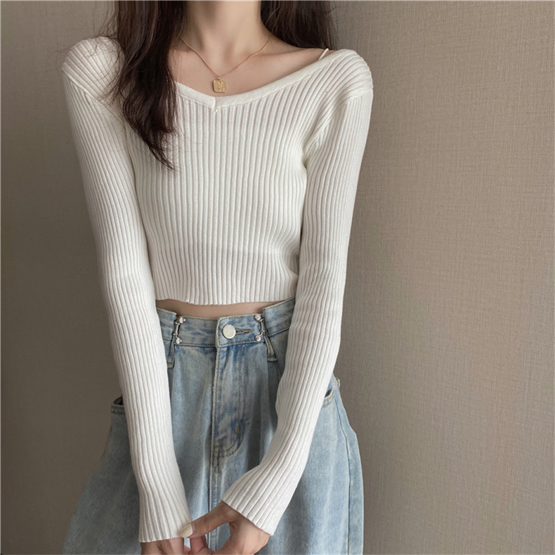 潮牌春秋辣妹白色短款上衣女長袖修身內搭薄款高腰露臍針織打底衫