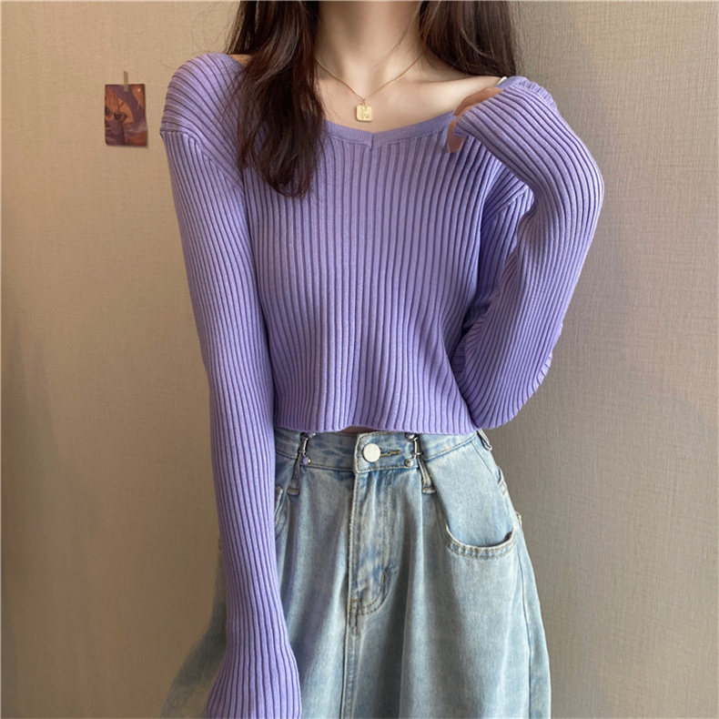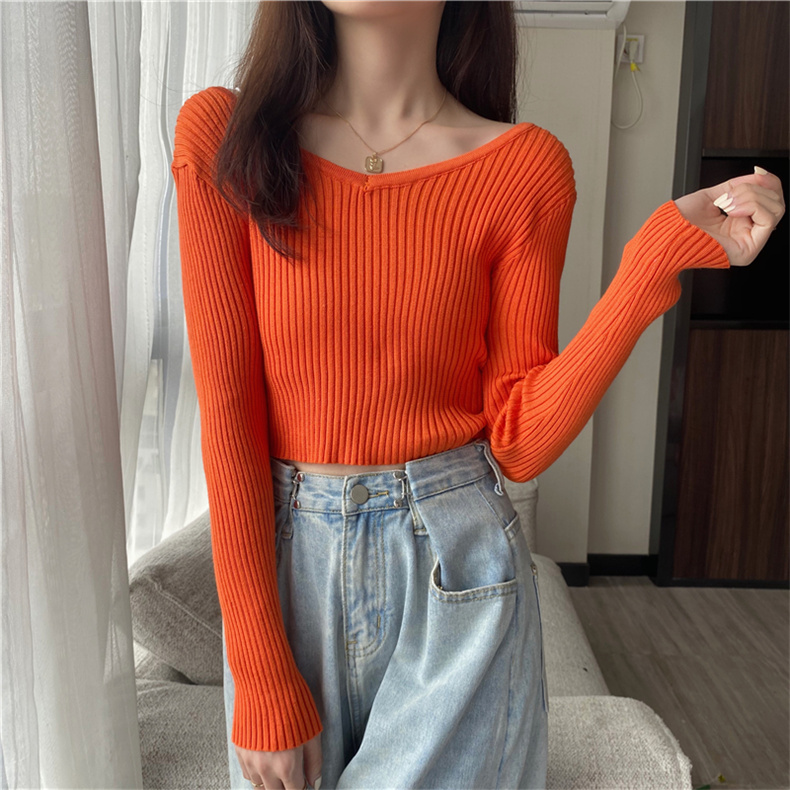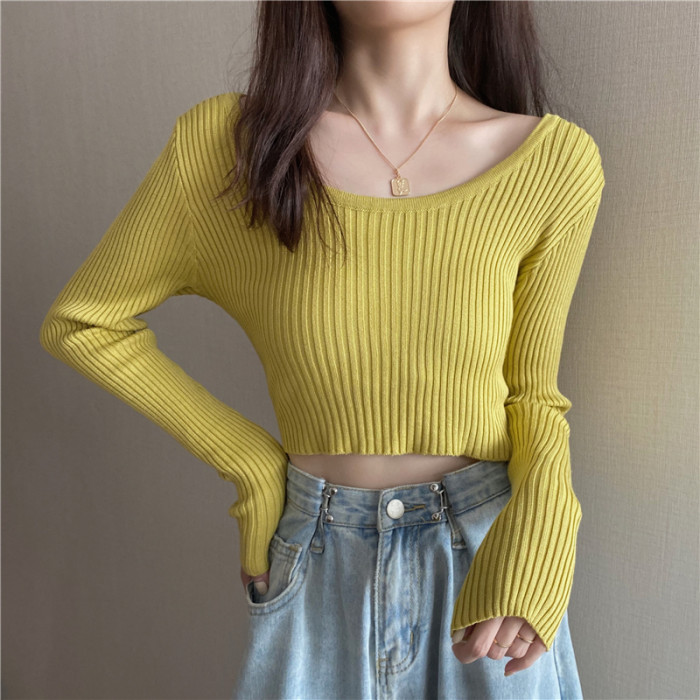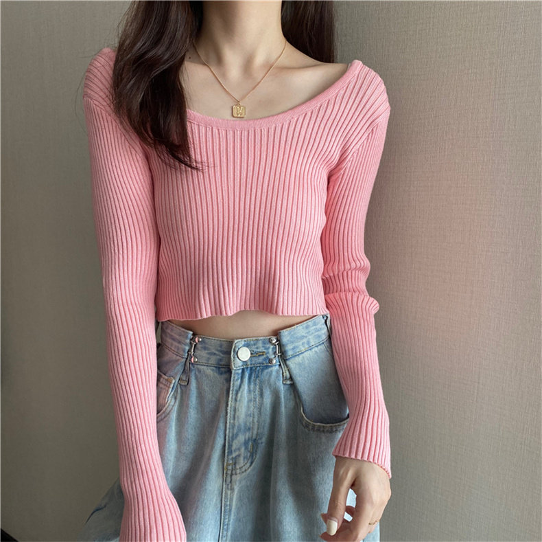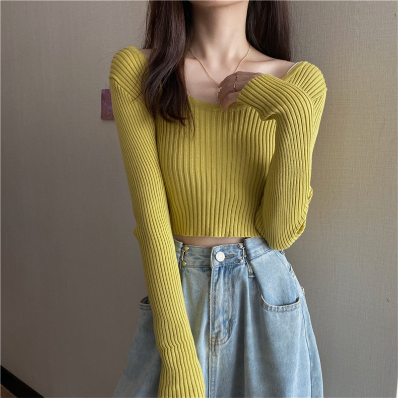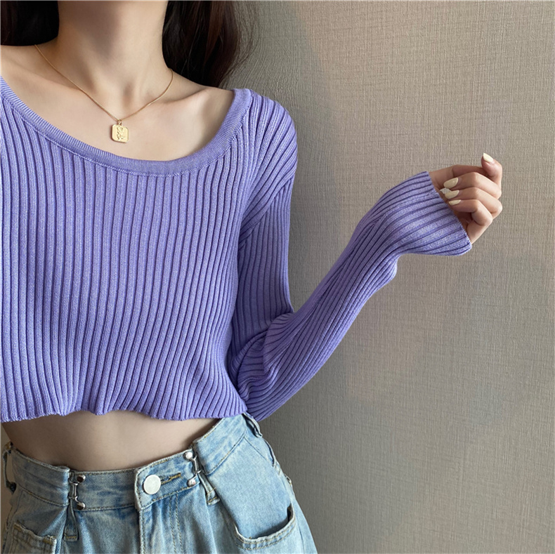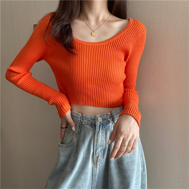 潮牌春秋辣妹白色短款上衣女長袖修身內搭薄款高腰露臍針織打底衫