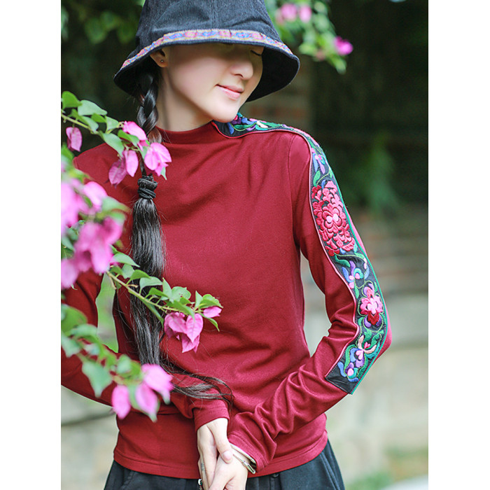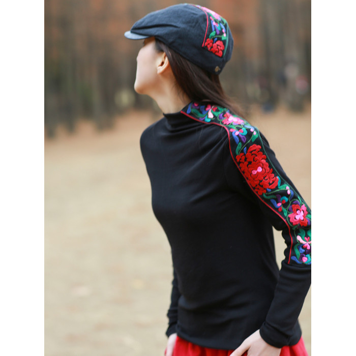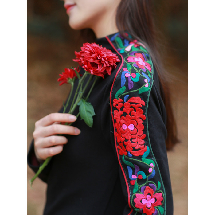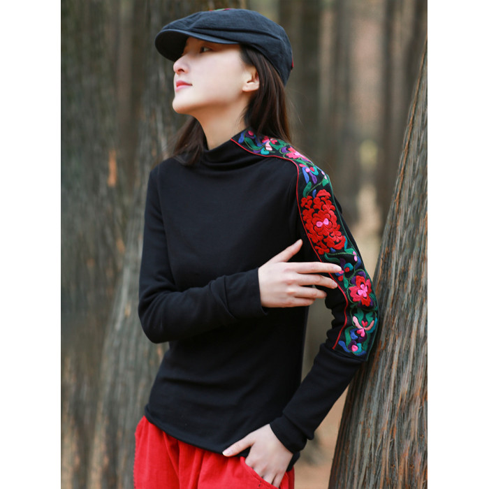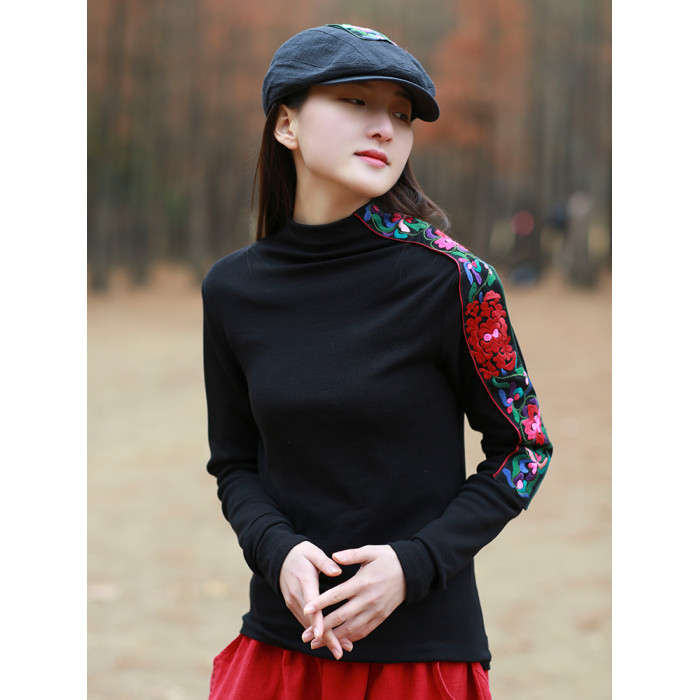 讀你原創民族風秋裝新款袖子綉花彈力針織上衣女打底衫9365