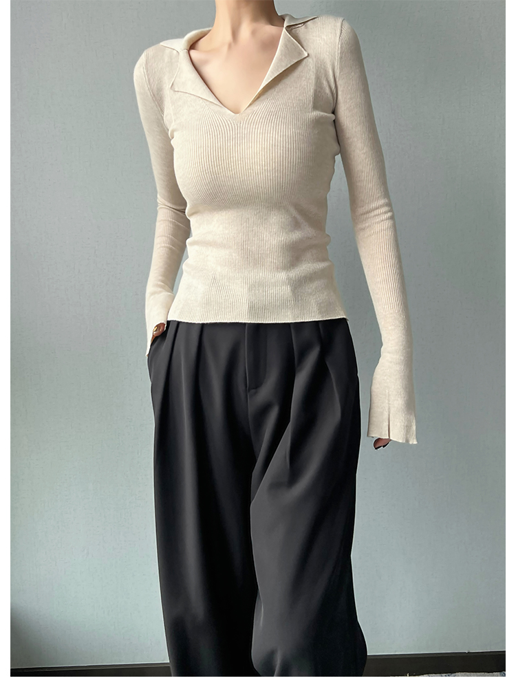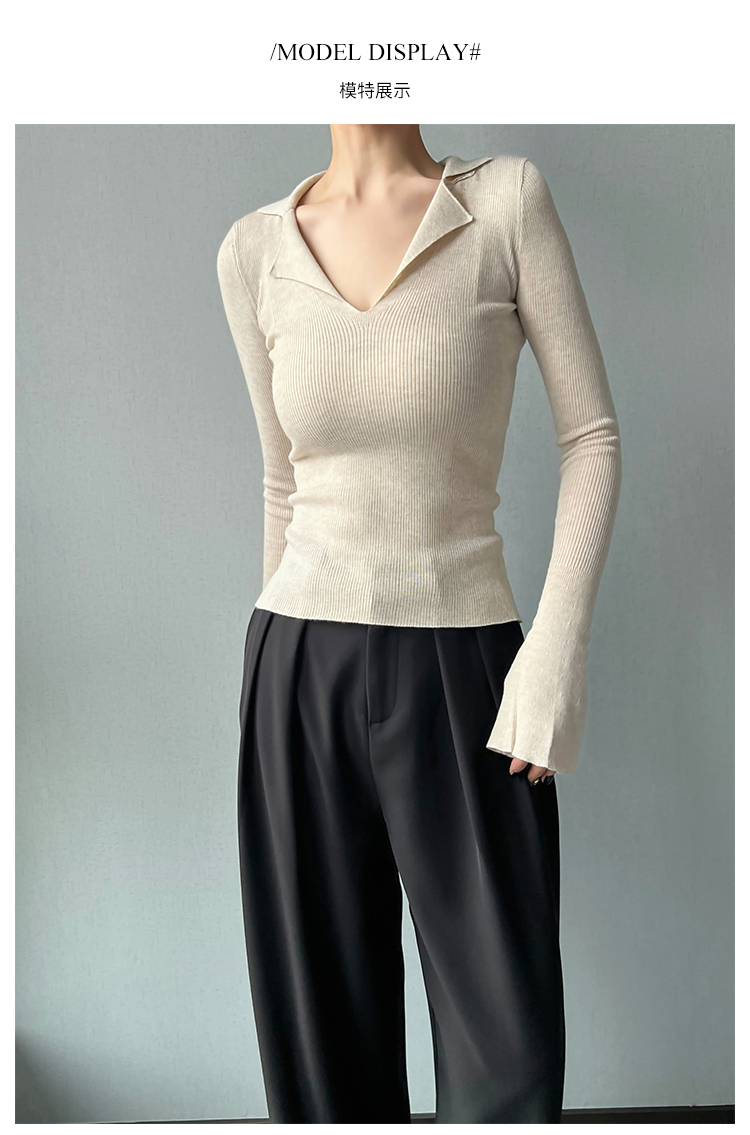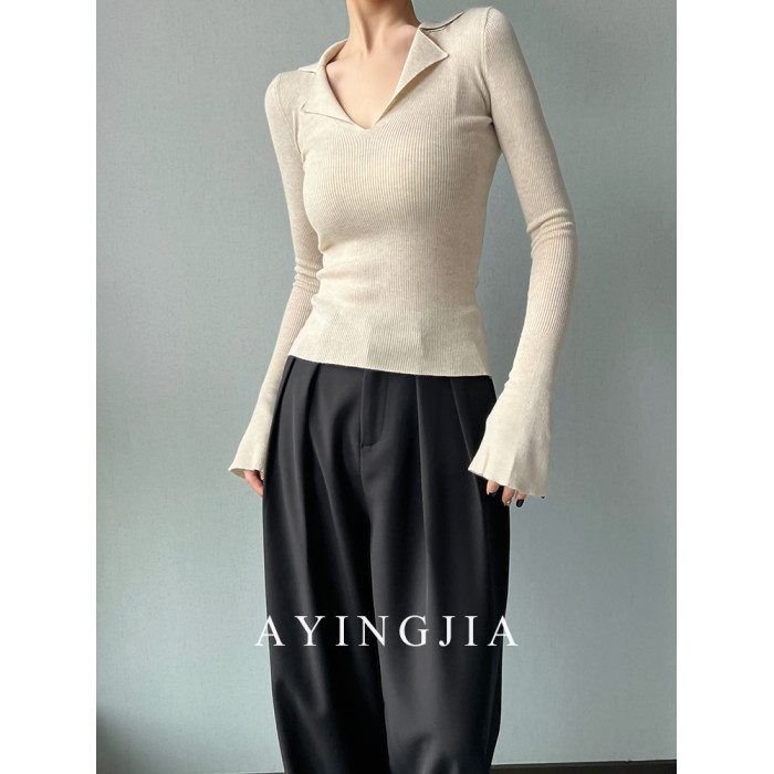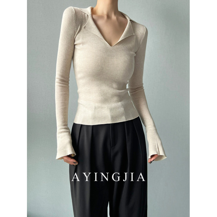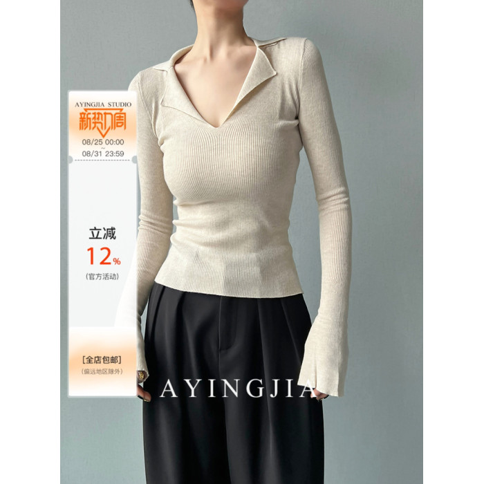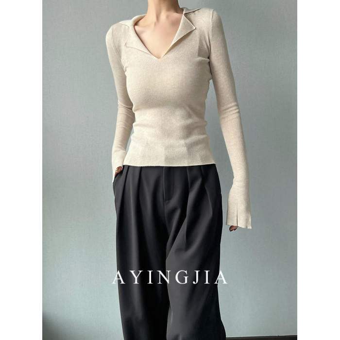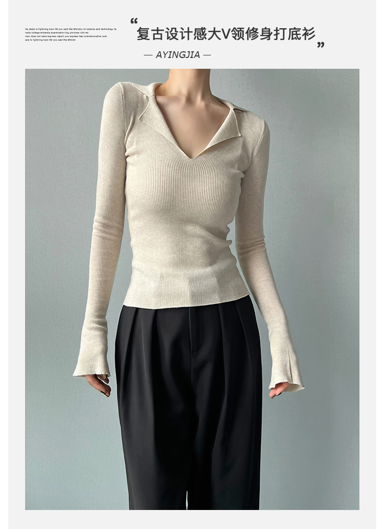 AYINGJIA 法式大V領針織衫女春內搭打底衫設計感小衆修身顯瘦上衣