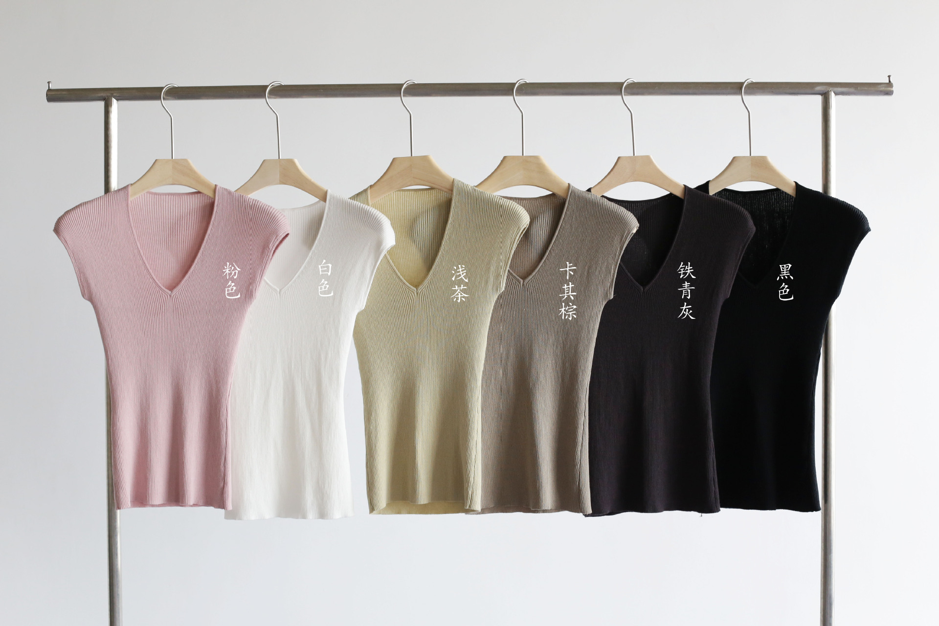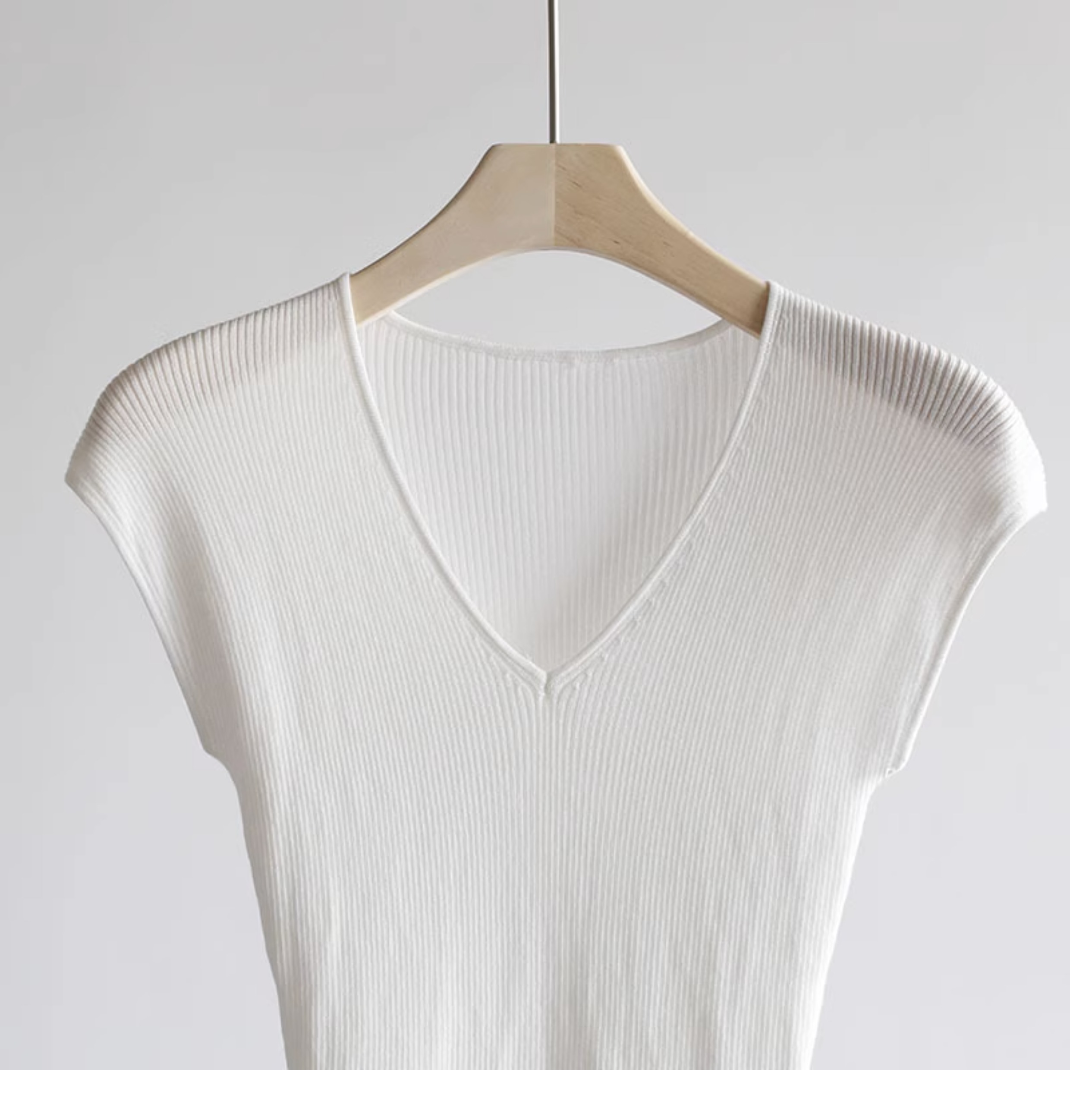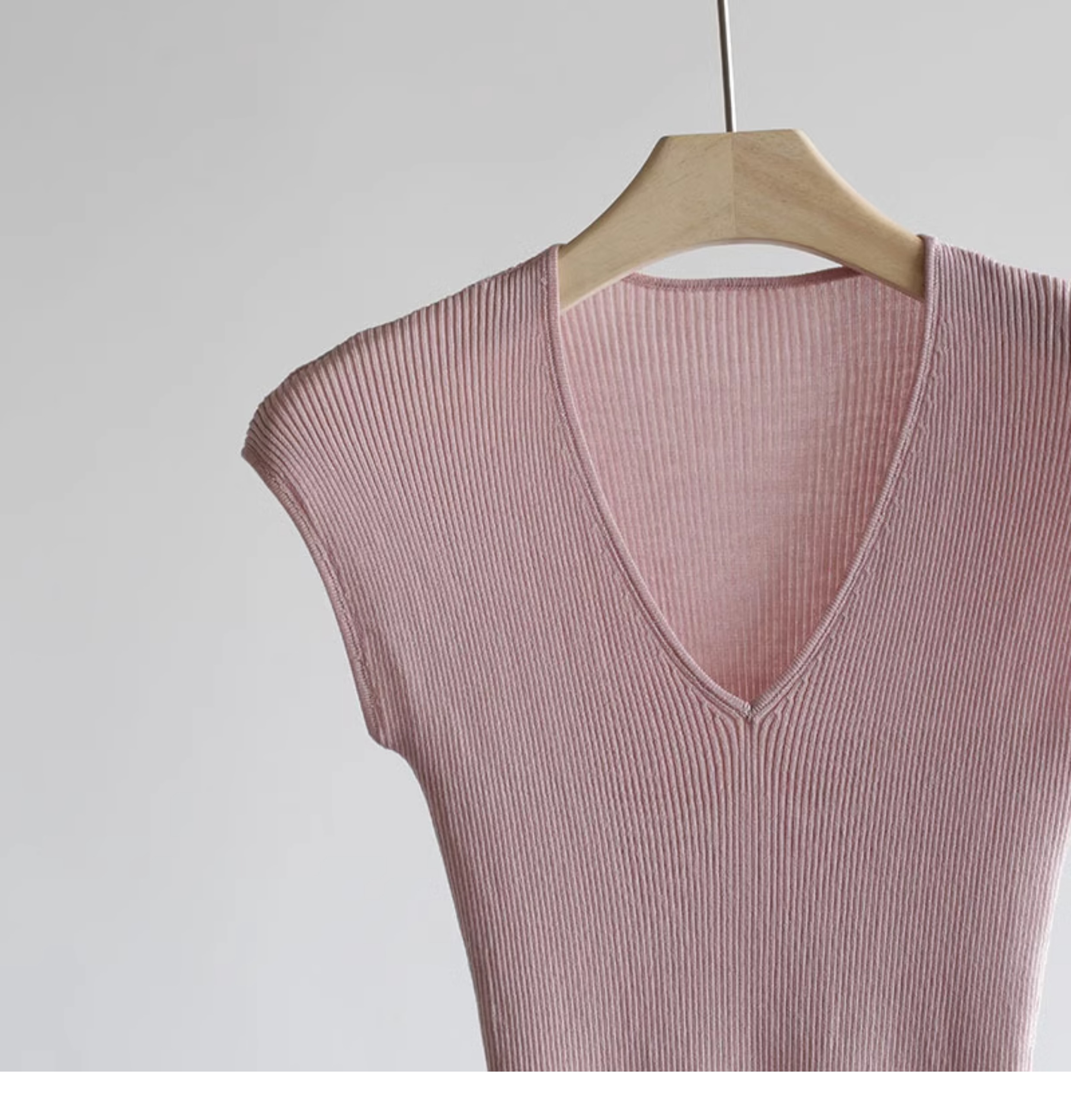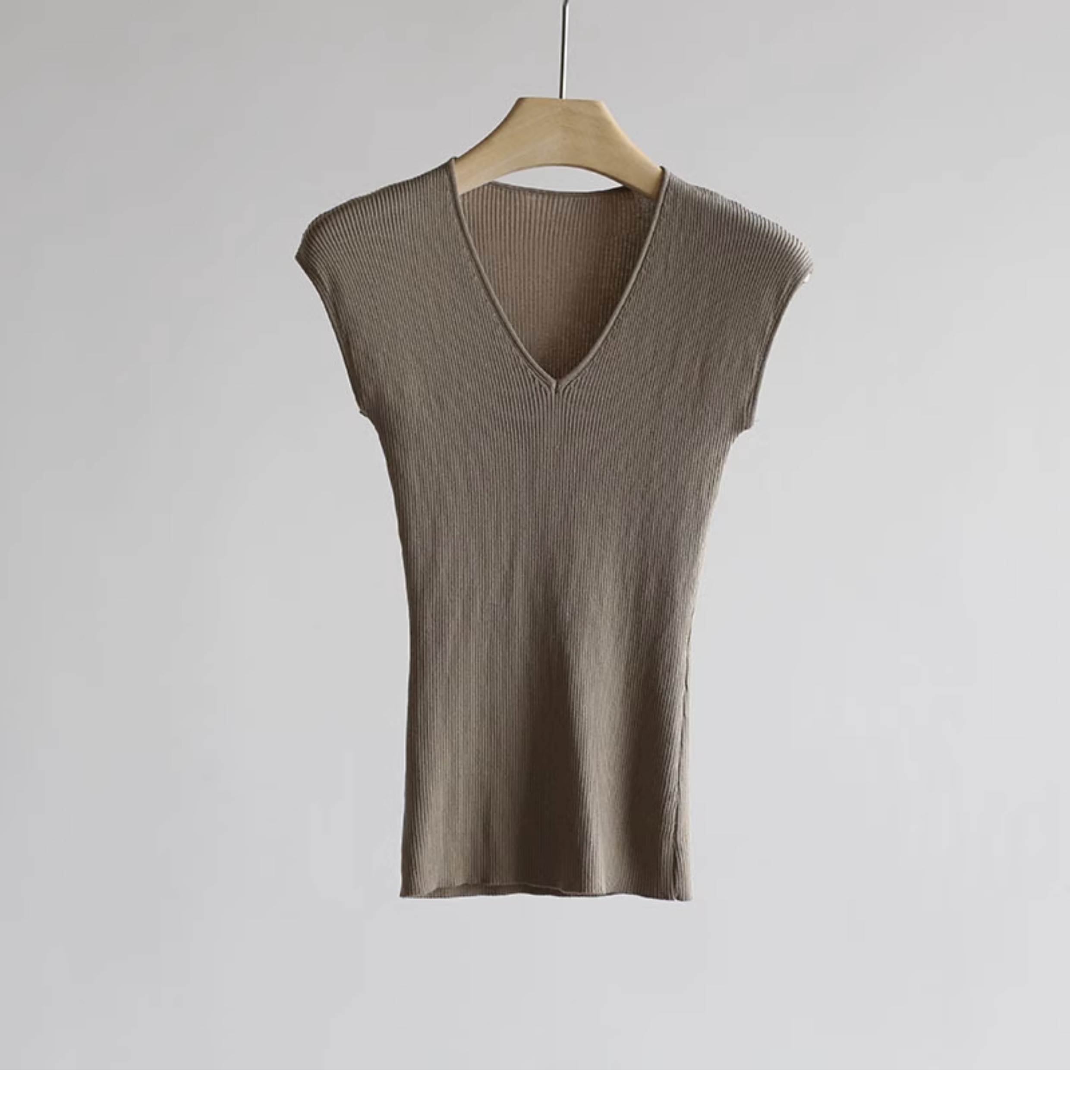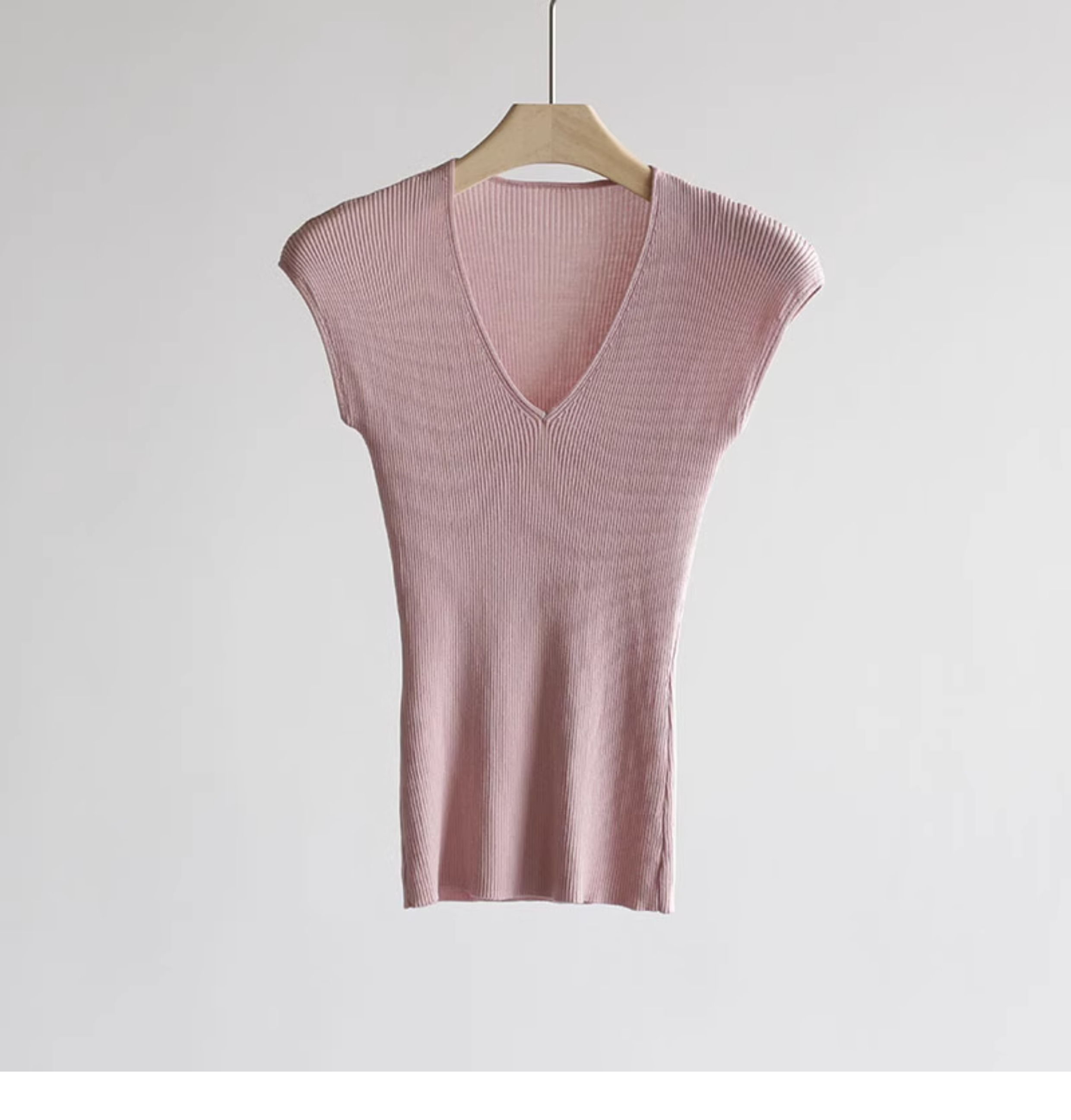 天絲萊賽爾V領針織衫女夏季新款修身顯瘦彈力打底衫薄款別致上衣