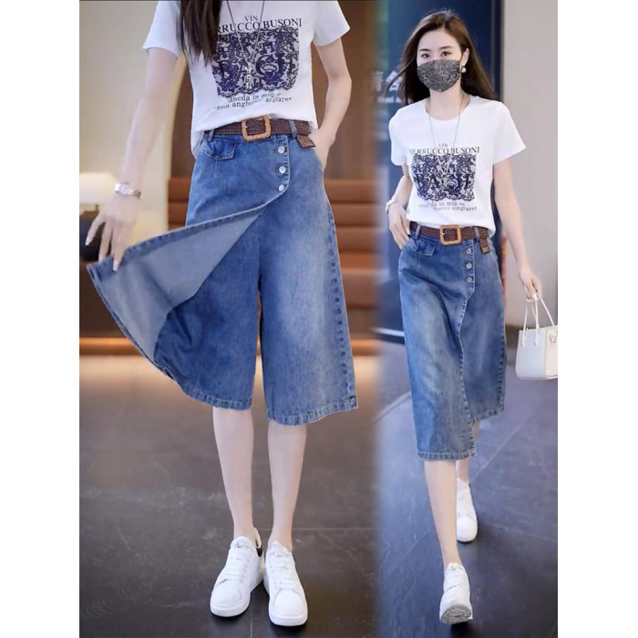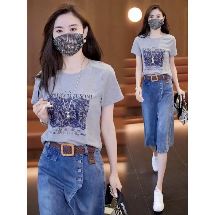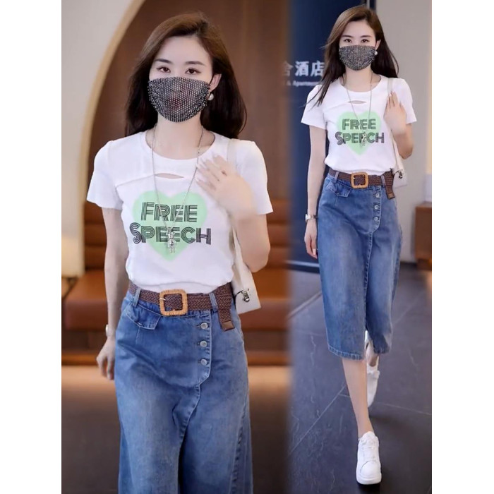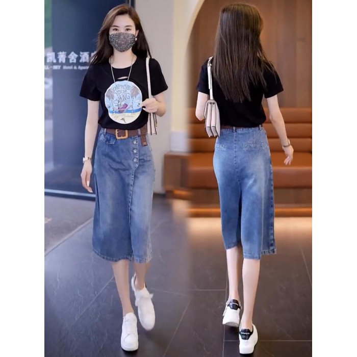 裙褲減齡漂亮洋氣質套裝上衣女夏高級感配半身裙假兩件牛仔連衣裙