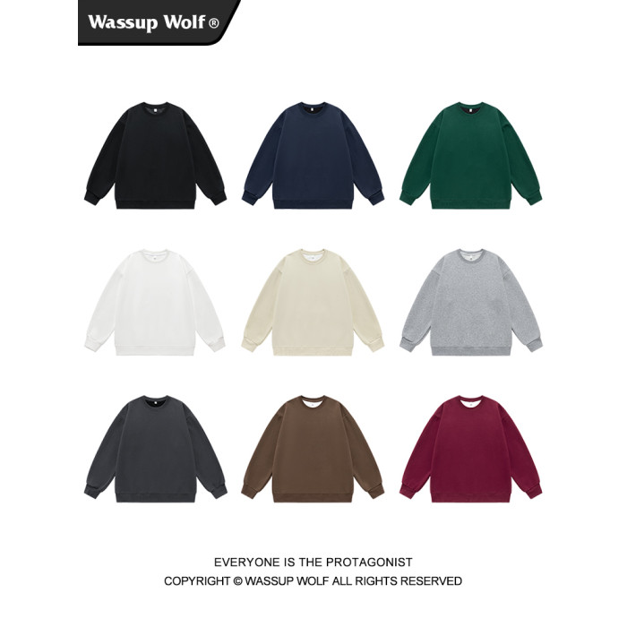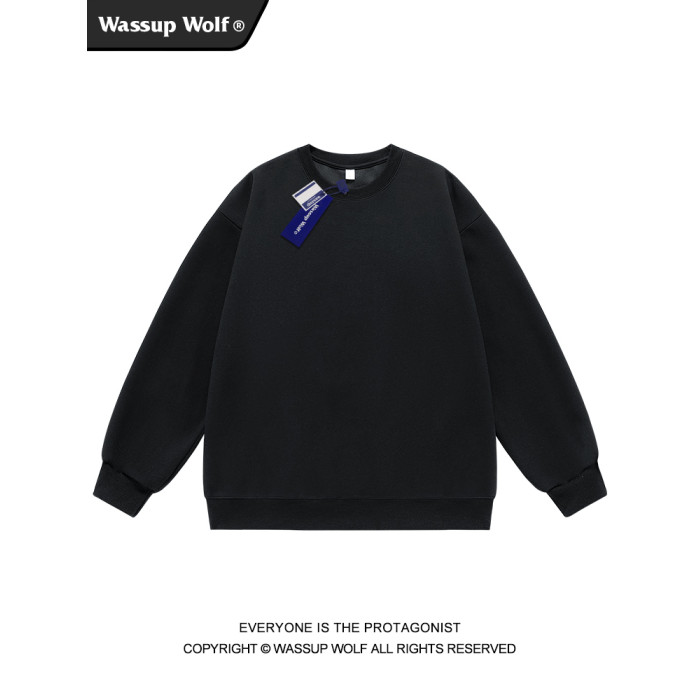 Wassup Wolf基礎款圓領衛衣男女簡約上衣情侶純色寬松純棉打底衫