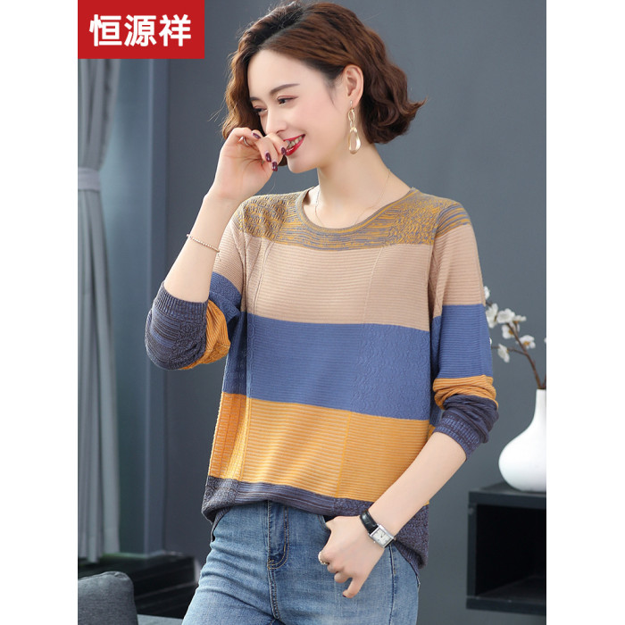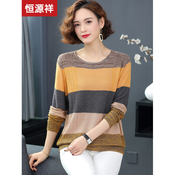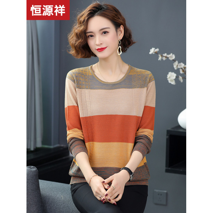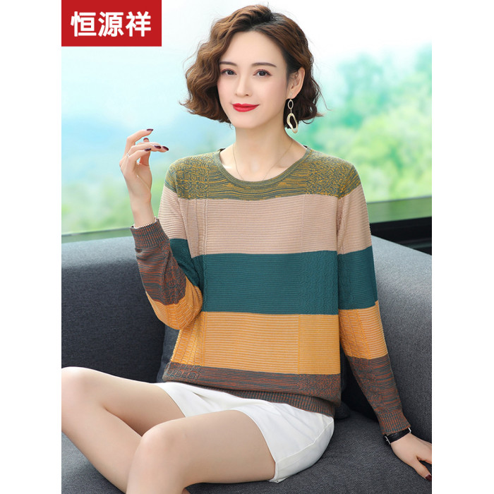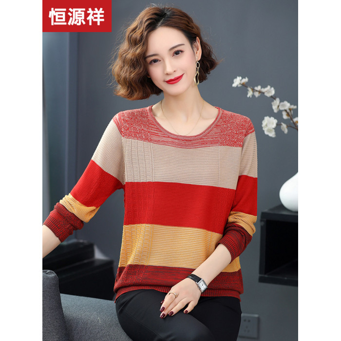 恒源祥條紋羊毛衫女圓領針織打底衫媽媽春秋薄款毛衣低領寬松上衣