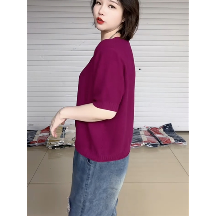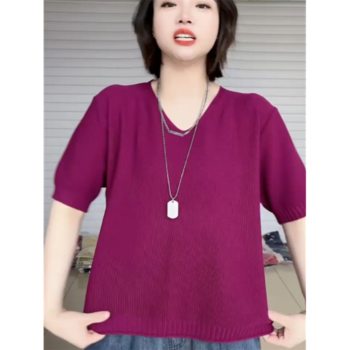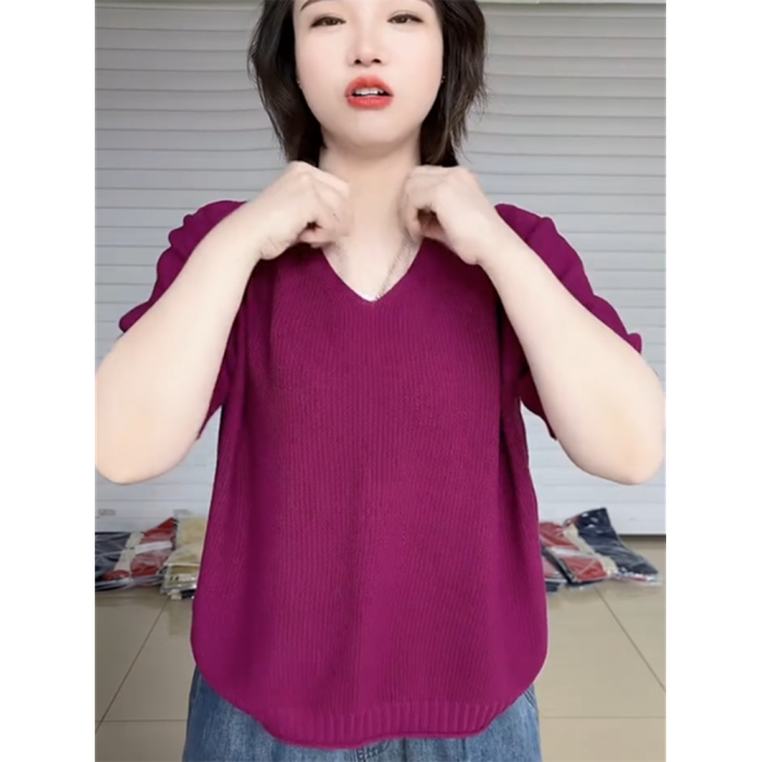 2025新款V領薄款棉麻針織衫女夏季韓版大碼短袖棉線寬松打底衫潮