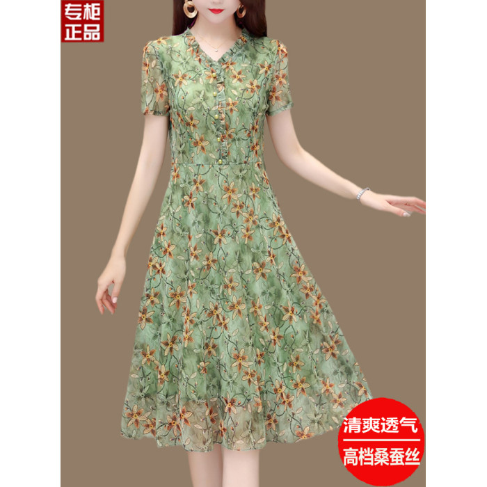 杭州大牌真絲桑蠶絲連衣裙夏季新款女裝高貴氣質媽媽遮肚碎花裙子