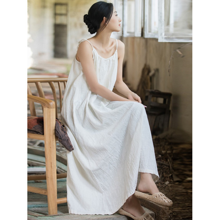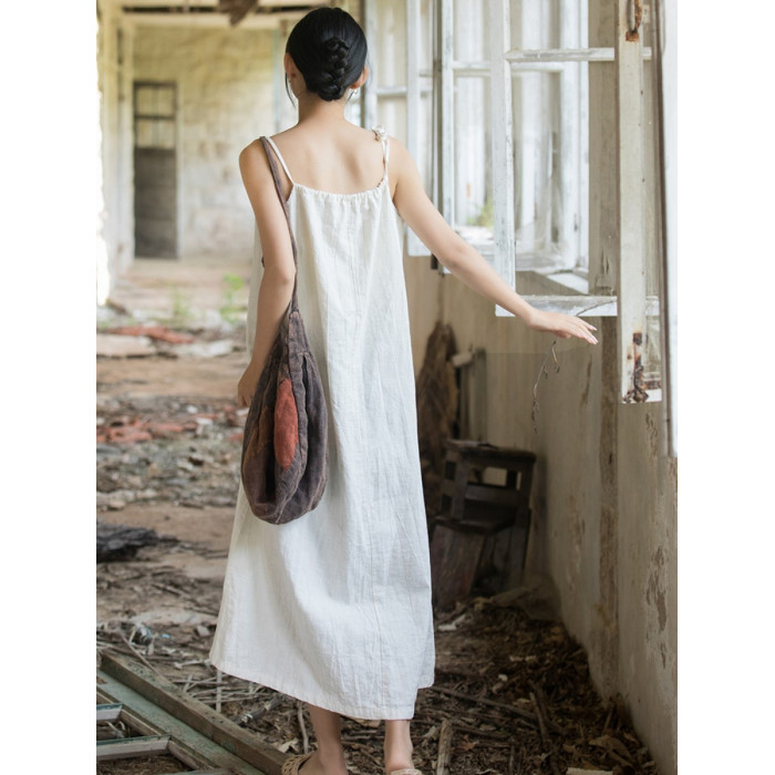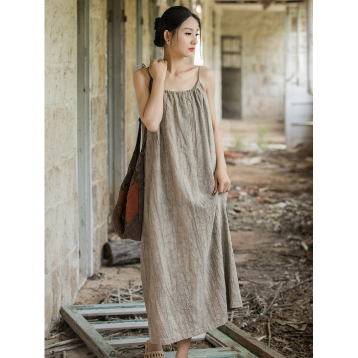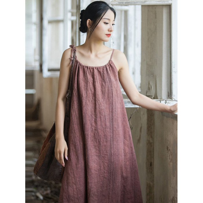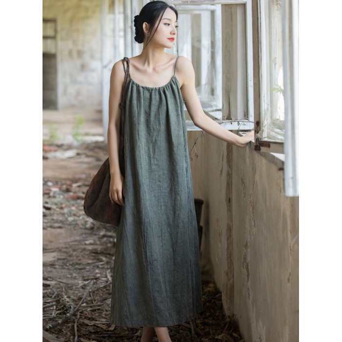 棉麻可調節連衣裙女夏季新款原創寬松復古顯瘦吊帶裙苧麻紥染長裙