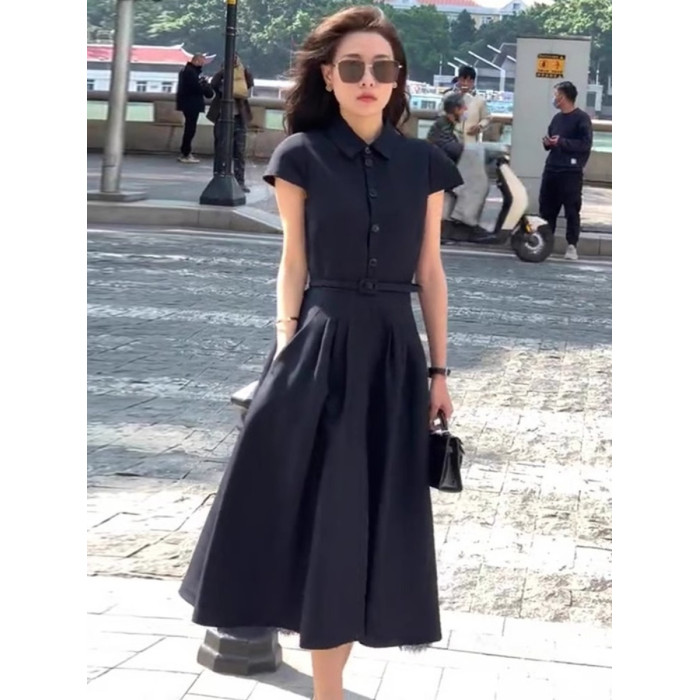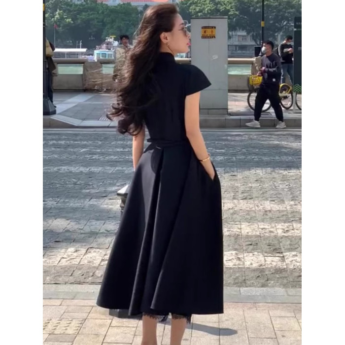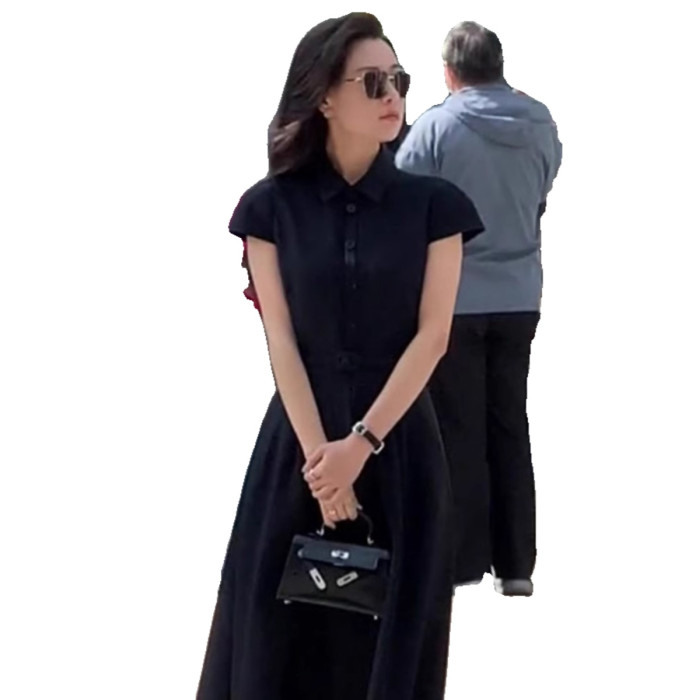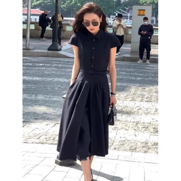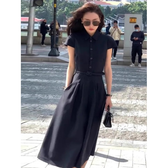 歐洲站2025新款法式赫本風氣質長裙輕奢高級感黑色襯衫連衣裙女夏