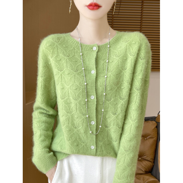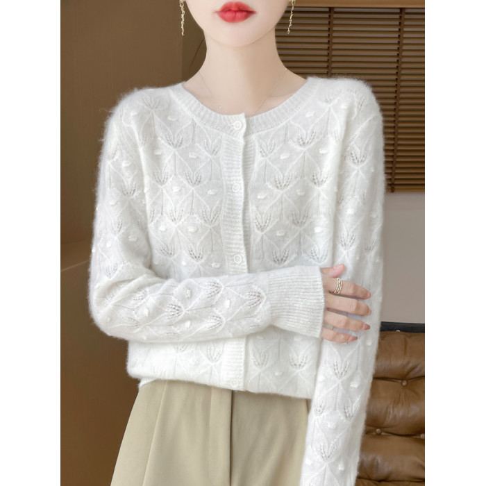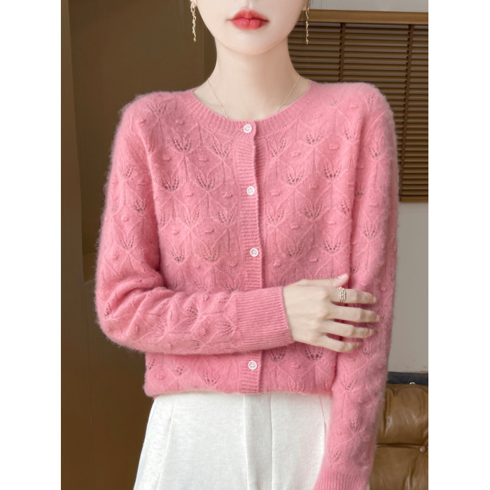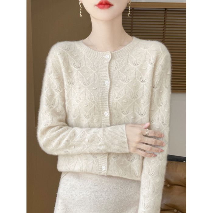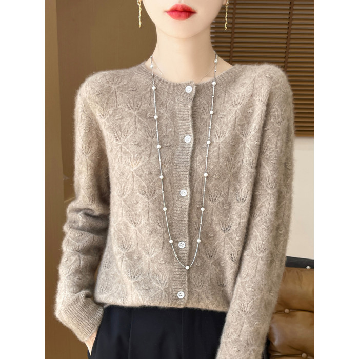 羊毛開衫女士圓領鏤空外套秋冬羊絨針織衫寬松洋氣打底衫薄款毛衣