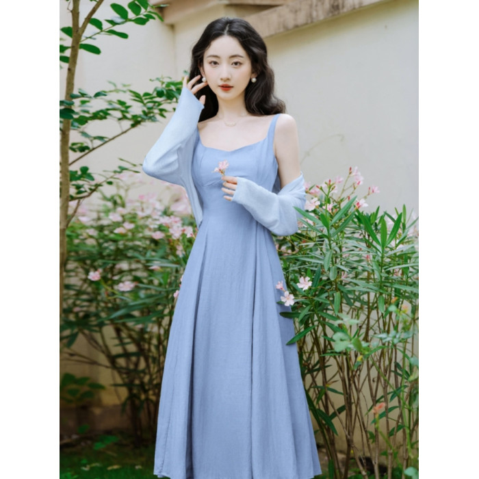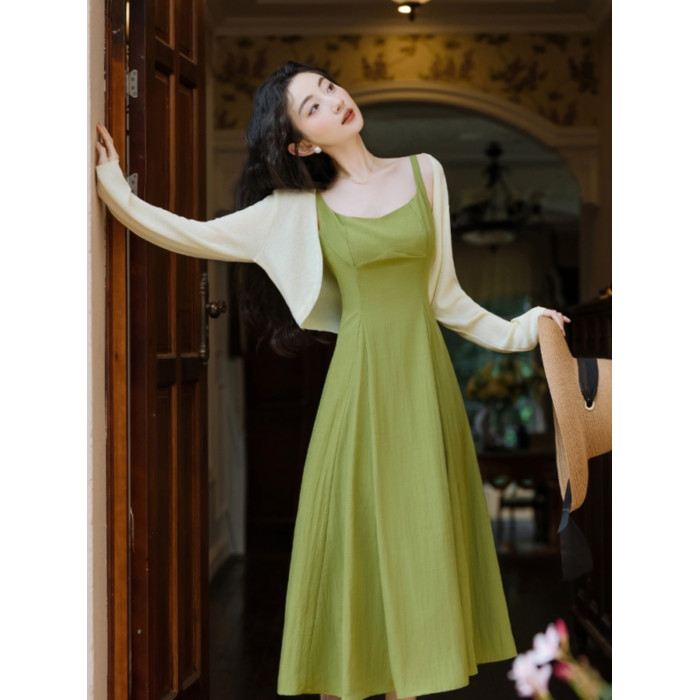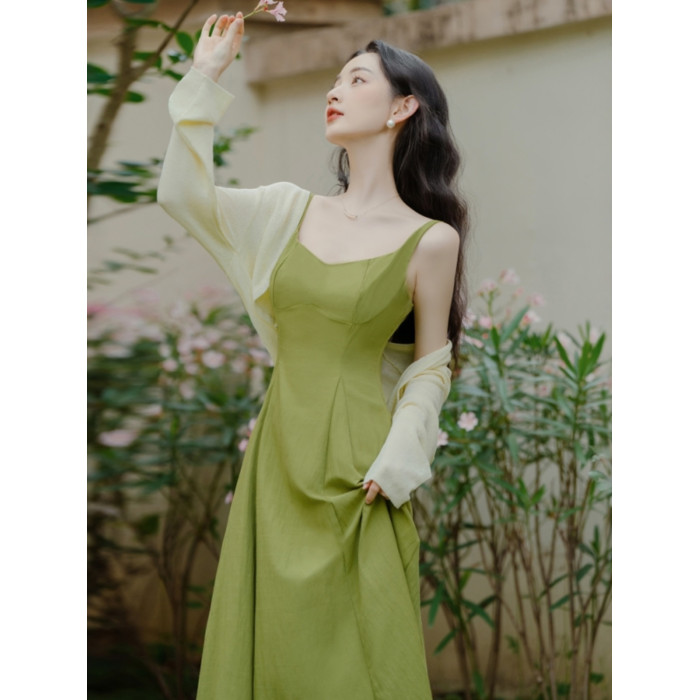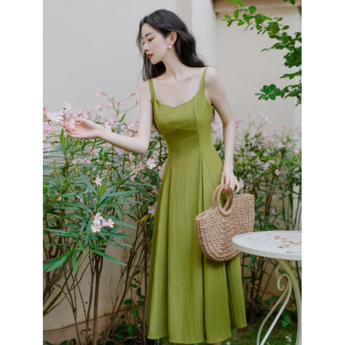 多巴胺絕美小裙子女夏日法式氣質綠色吊帶連衣裙海邊度假沙灘長裙