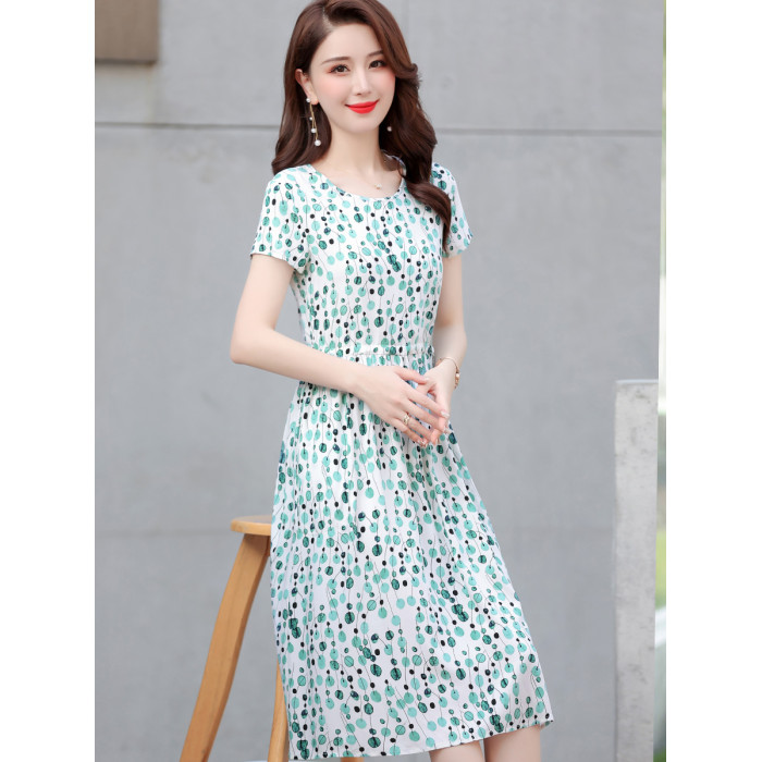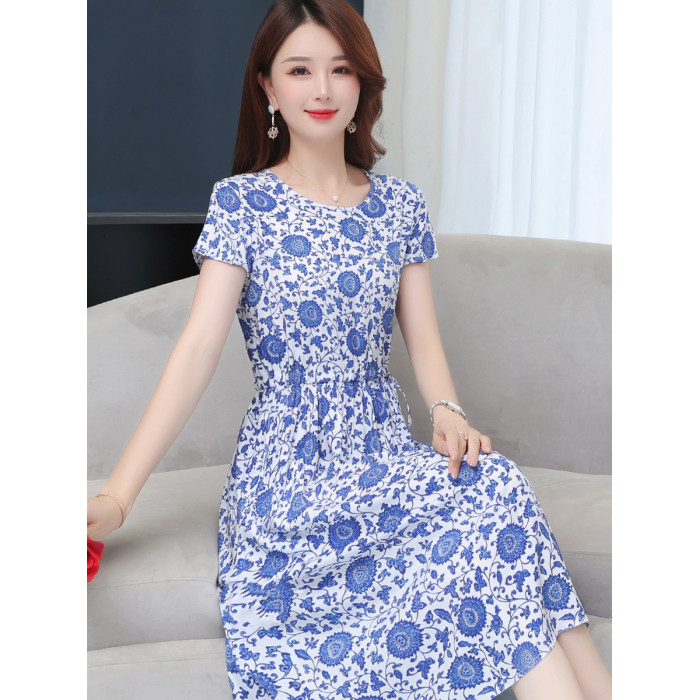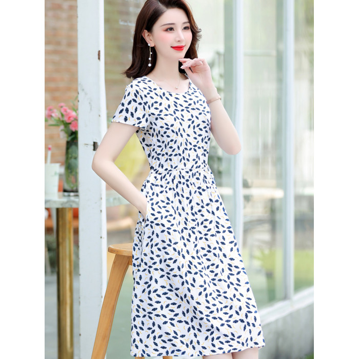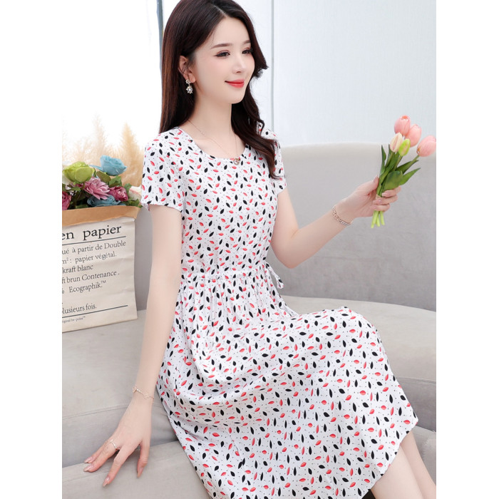 新款高級棉綢連衣裙女夏季時尚短袖收腰中長碎花綿綢外穿大擺裙子