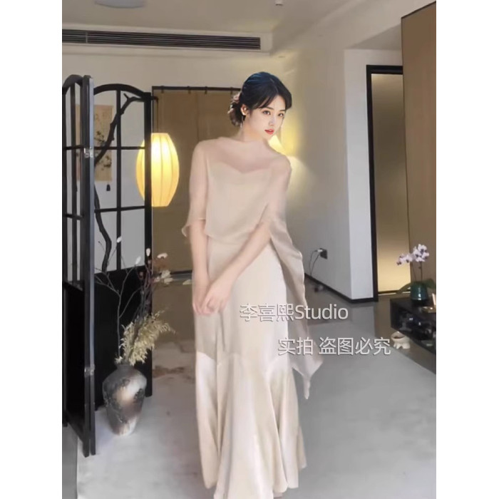 新中式國風清冷感小衆設計飄逸防曬披肩魚尾吊帶連衣裙套裝裙女夏