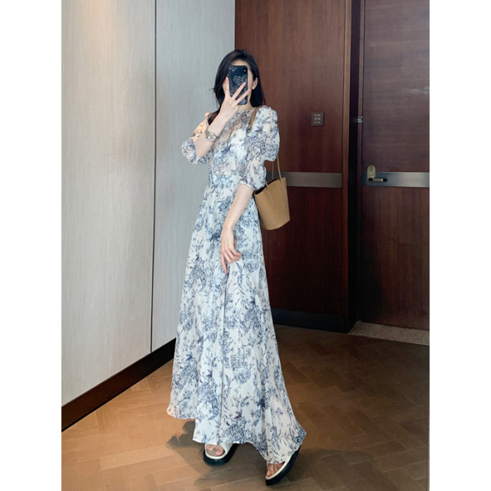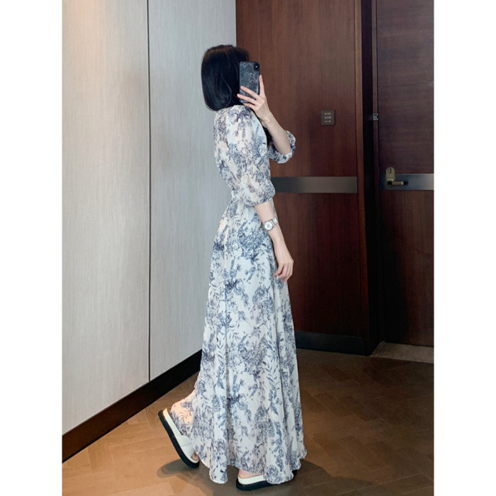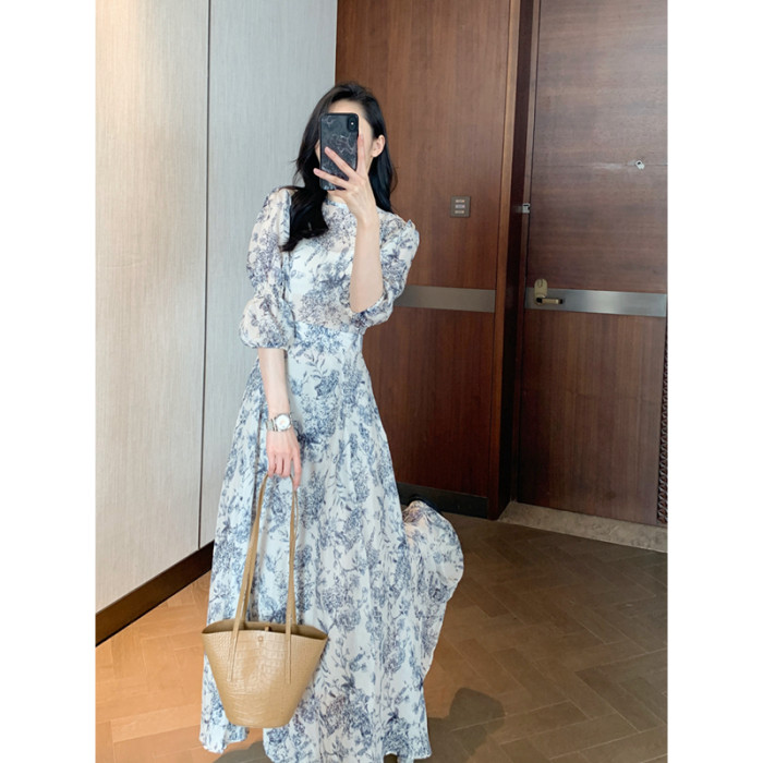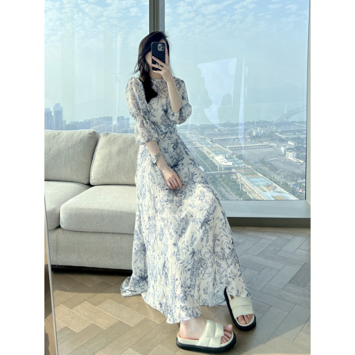 魚餘2025新款夏季浪漫韓版氣質灰色藍碎花雪紡連衣裙長裙女中長款