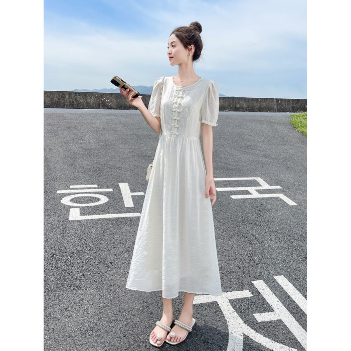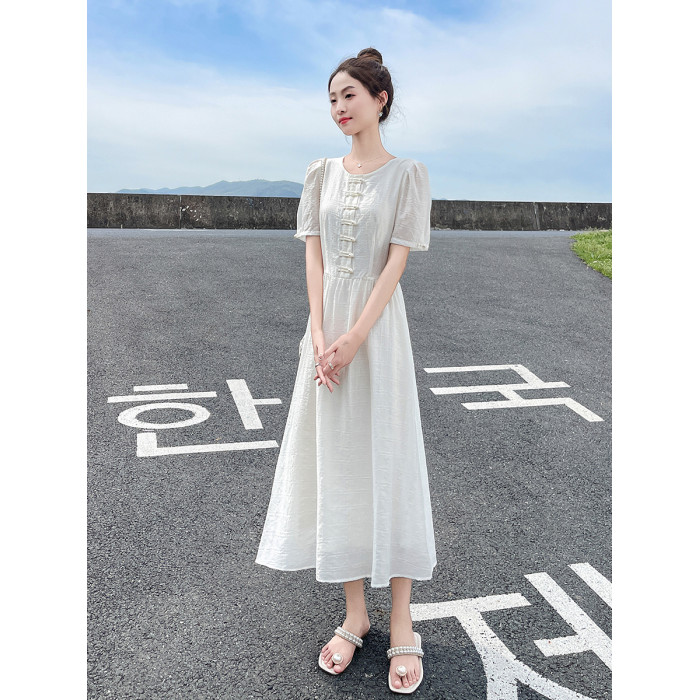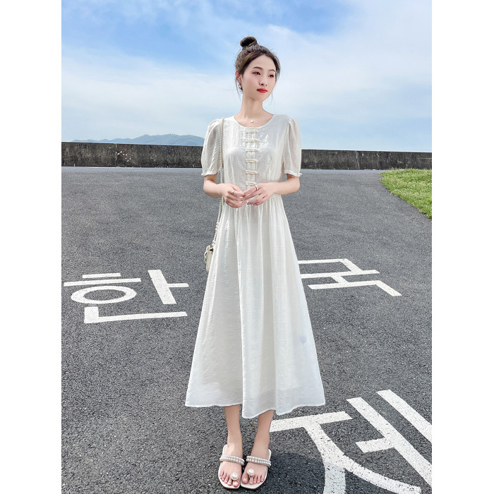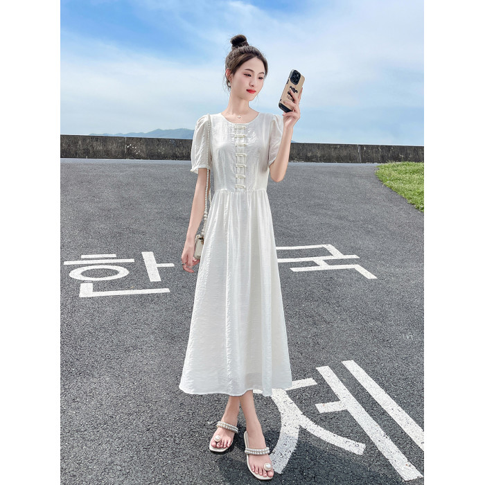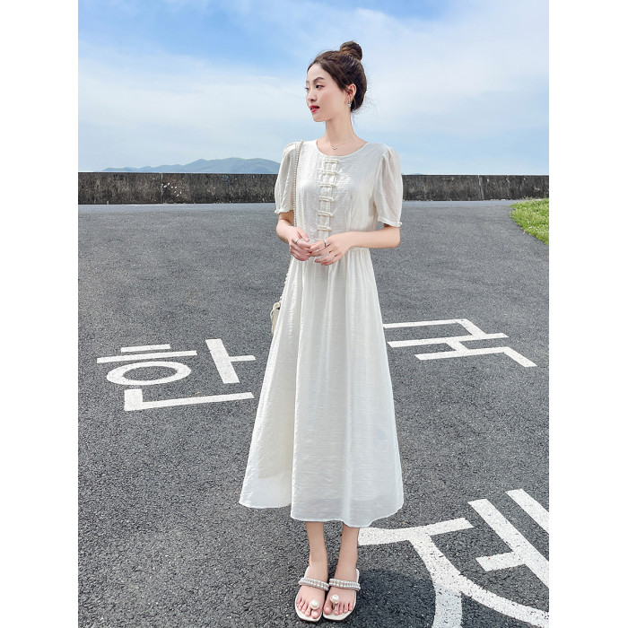 白色新中式連衣裙女夏季2025新款國風盤釦收腰顯瘦高貴典雅氣質