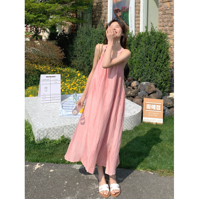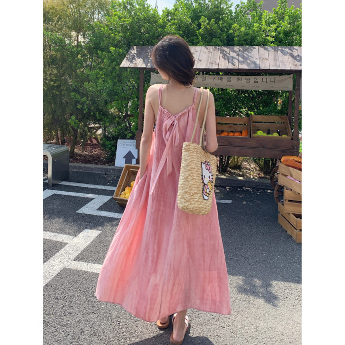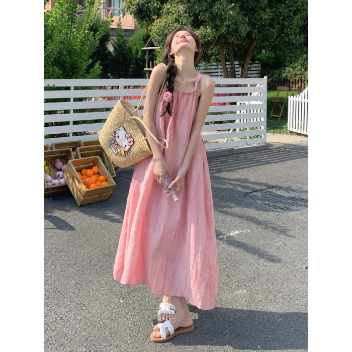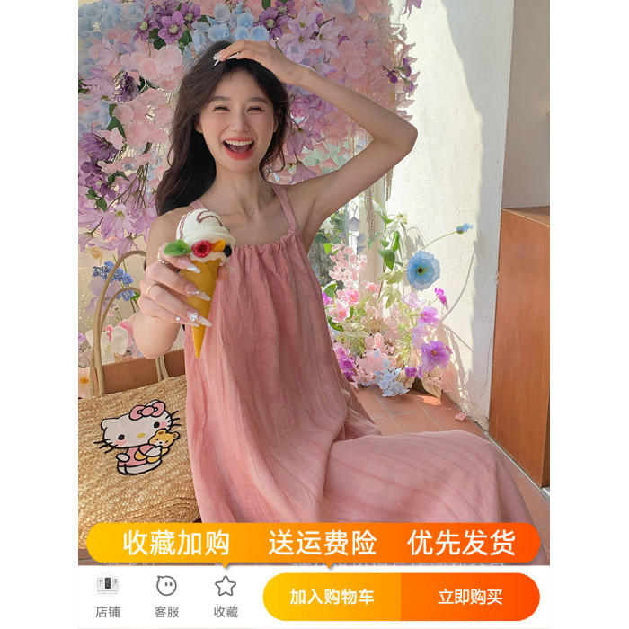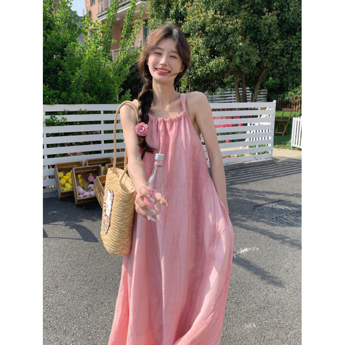 粉色吊帶連衣裙2025夏新款絕美溫柔慵懶風露背海邊度假風沙灘長裙