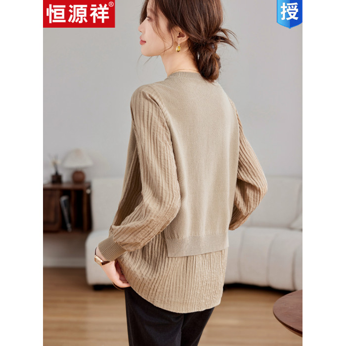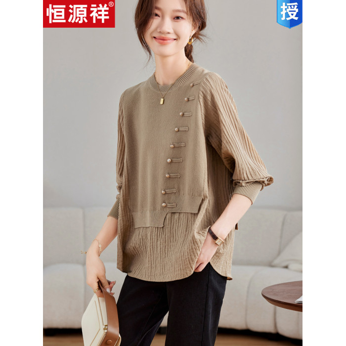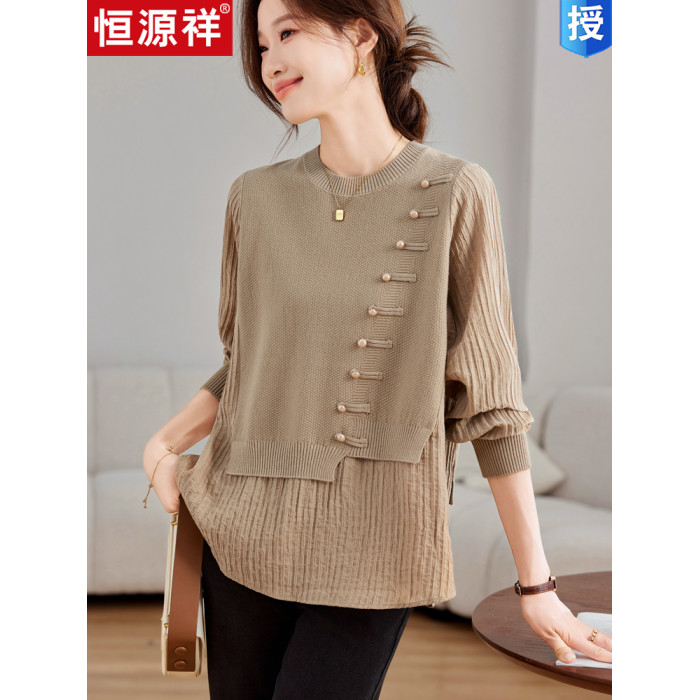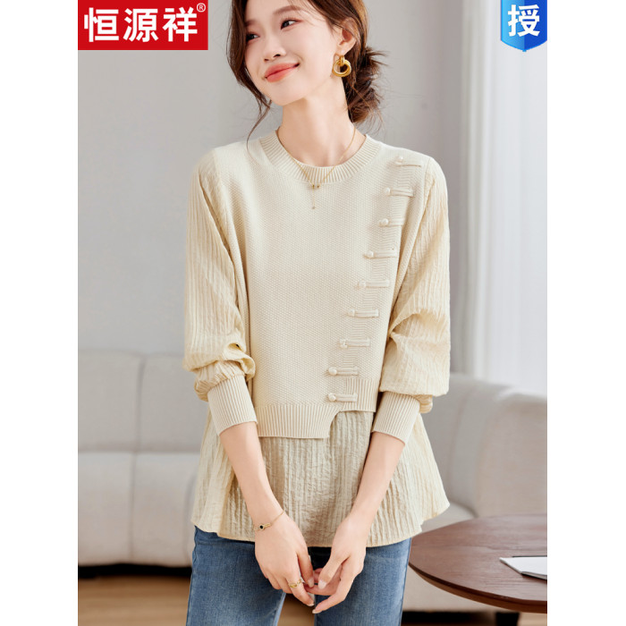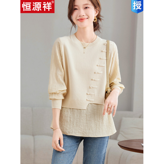 恒源祥國風新中式假兩件秋季上衣寬松藏肉打底衫顯瘦外穿針織衫女