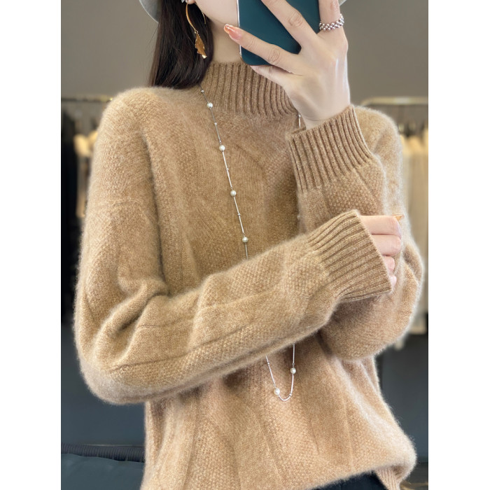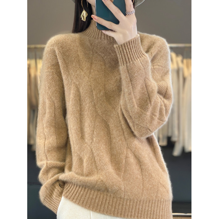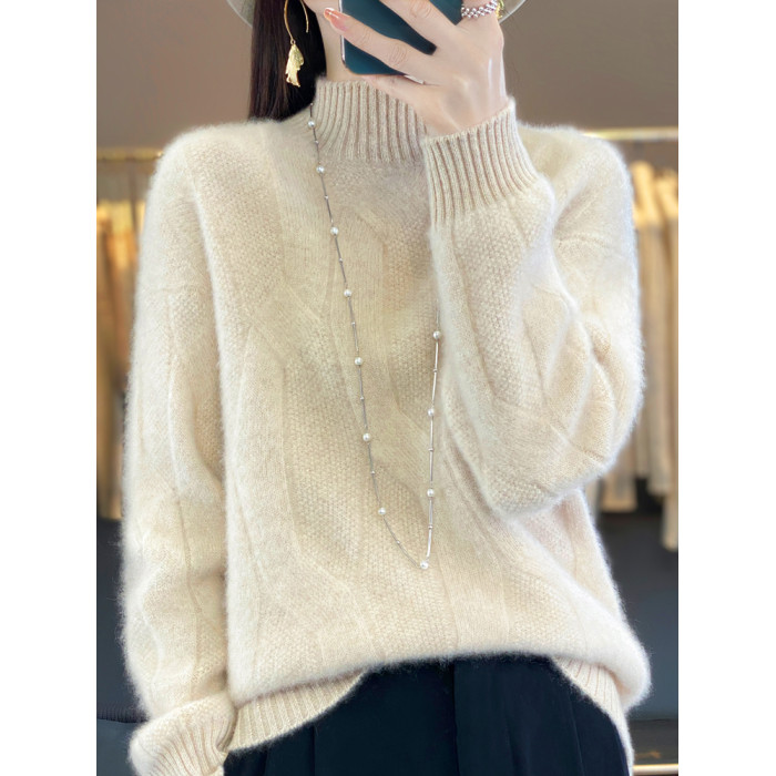 絞花加厚保暖羊絨毛衣女秋冬新款半高領套頭慵懶羊毛針織打底衫潮