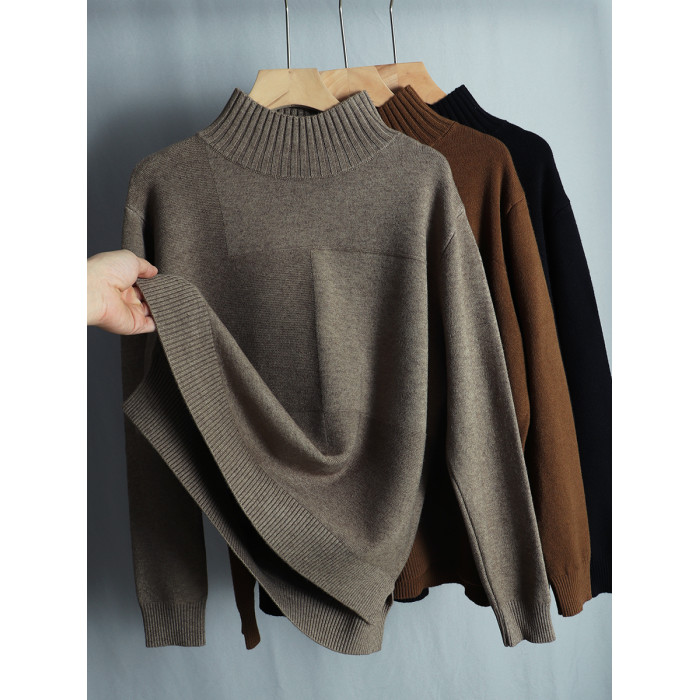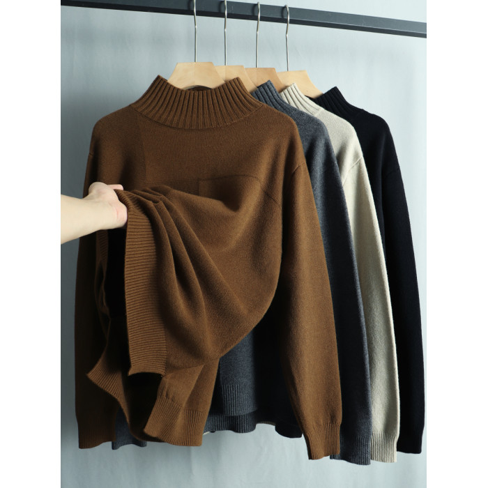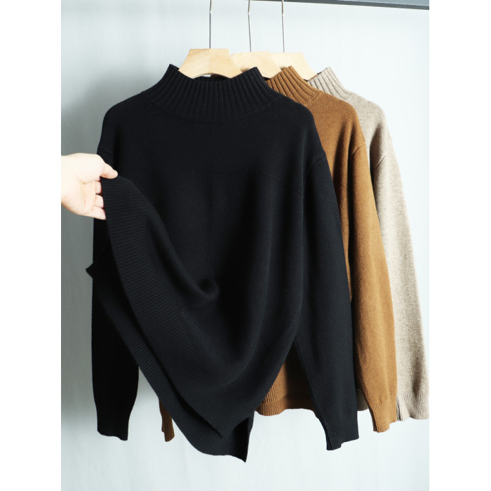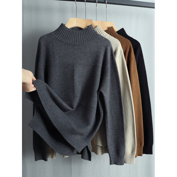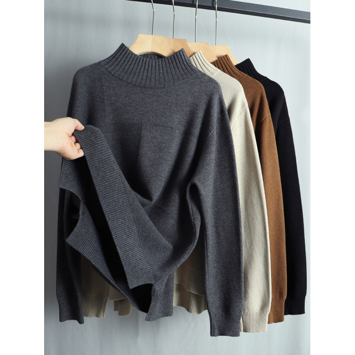 春季寬松大碼顯瘦針織衫毛衣女半高領長袖套頭上衣開叉遮肚打底衫