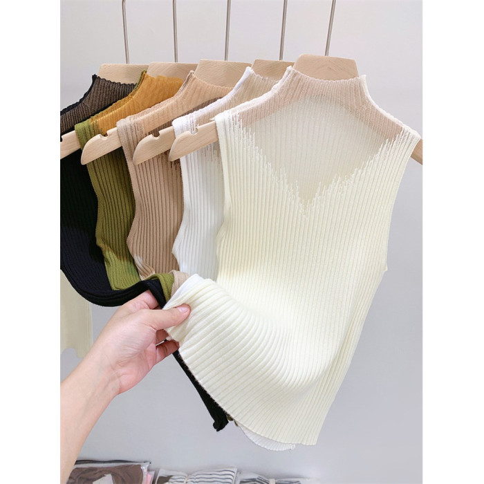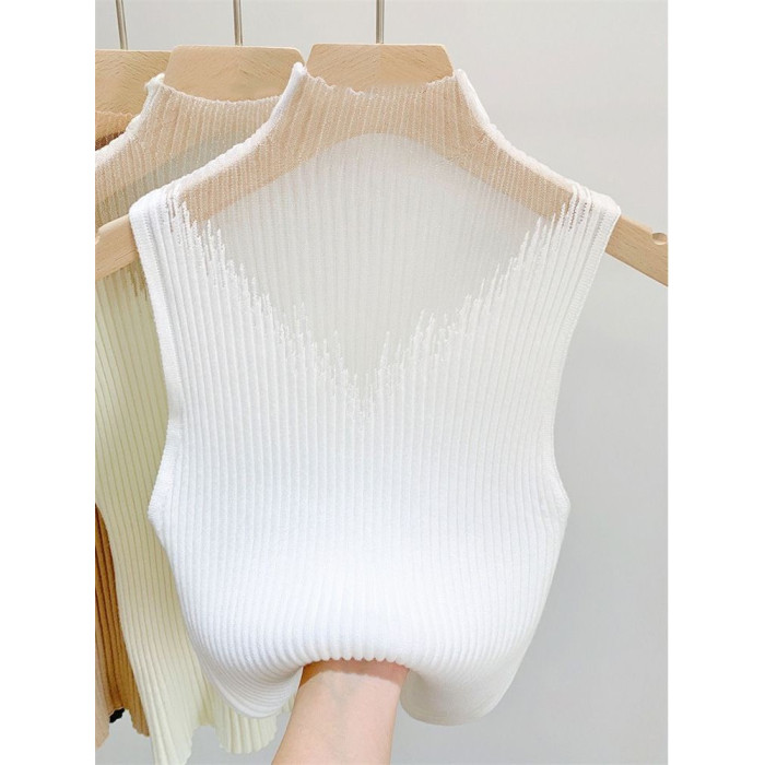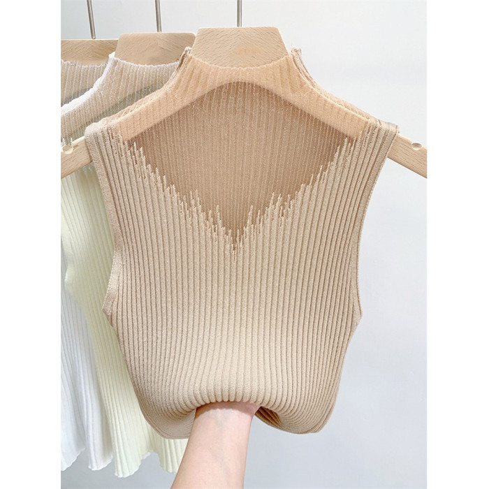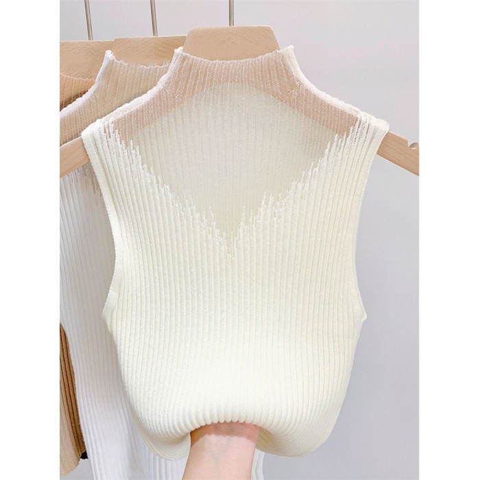 品牌撤櫃網紗半高領針織吊帶背心曡穿內搭打底衫蕾絲無袖坎肩馬甲