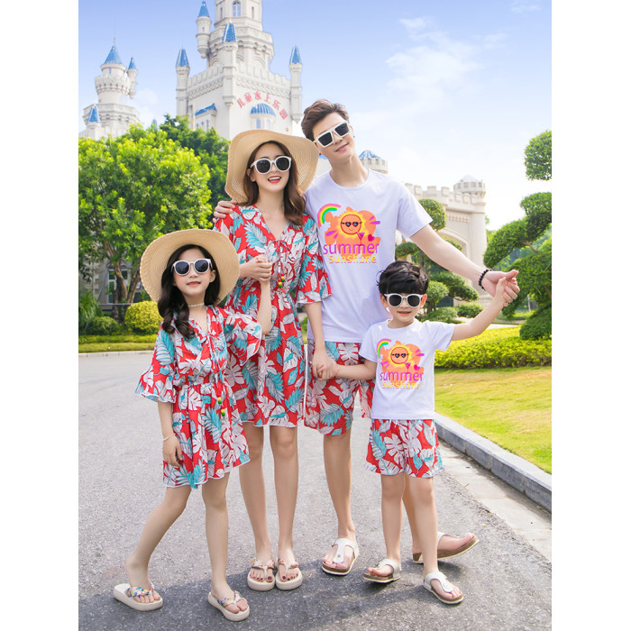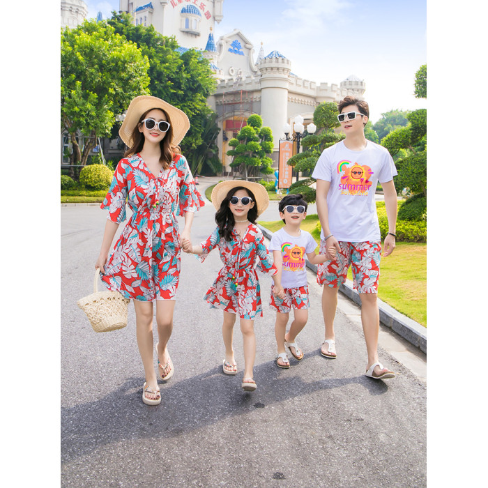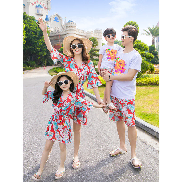 沙灘親子裝夏裝2025新款潮一家三口四口母子家庭套裝母女連衣裙子