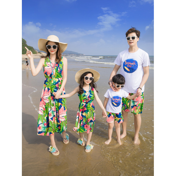 沙灘親子裝夏裝一家三口四口套裝全家裝三亞海邊旅遊母女連衣長裙