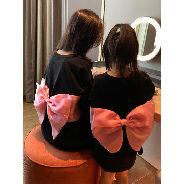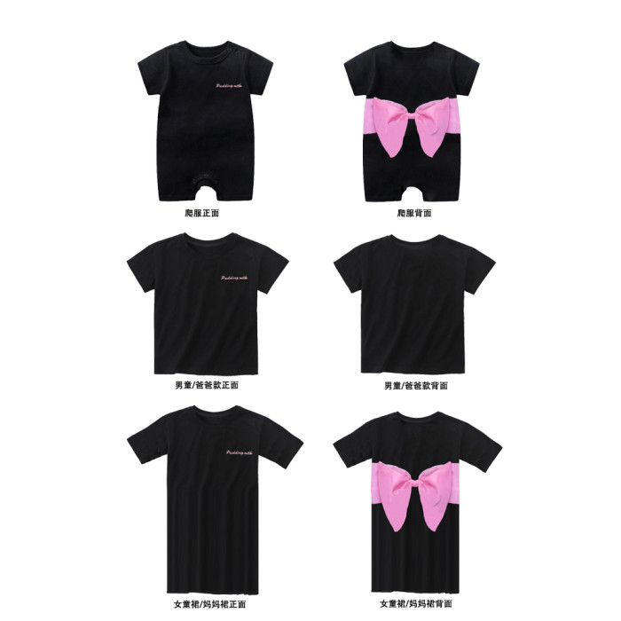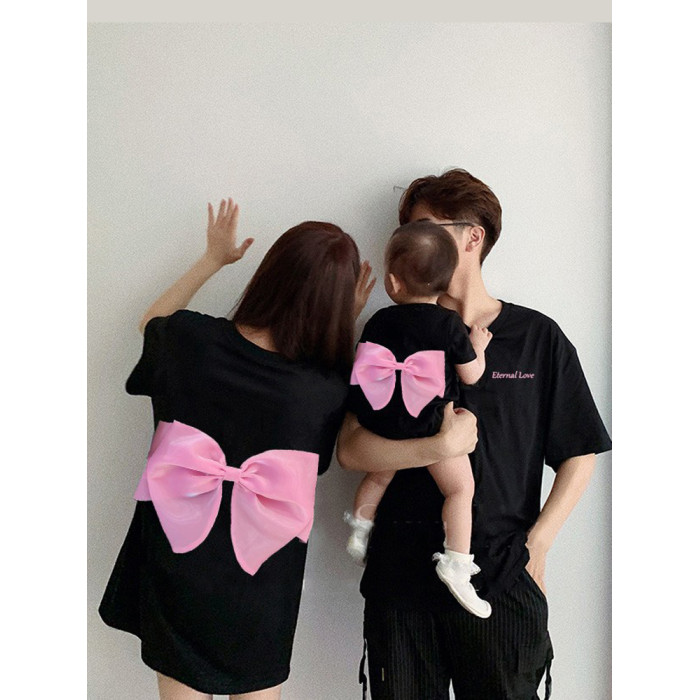 蝴蝶結親子裝夏款2025新款一家三口四口男女寶黑色母女裝短袖t恤