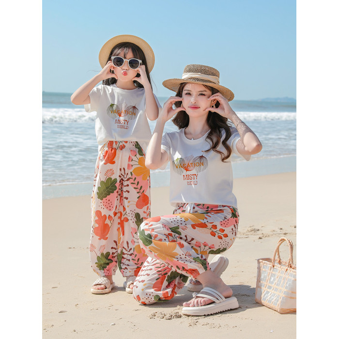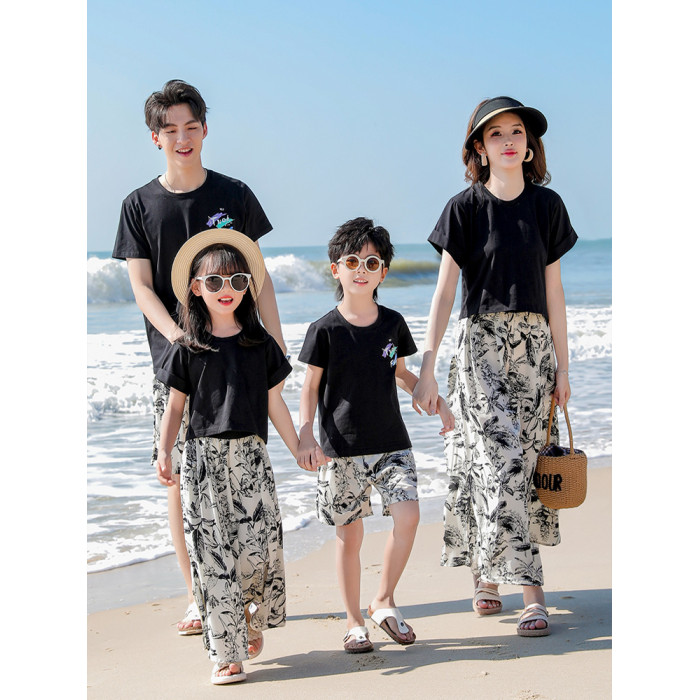 海邊度假親子裝夏款一家三口炸街母子三亞沙灘連衣裙母女裝海洋風