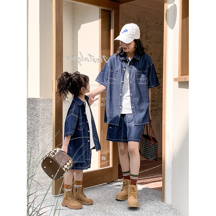 炸街親子裝一家三口夏季純棉母女牛仔套裝洋氣韓版薄款母子兩件套