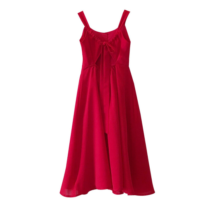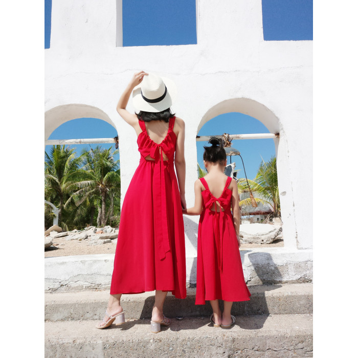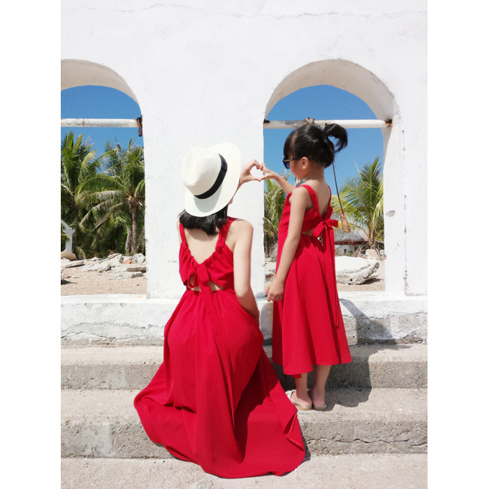 2024海邊度假親子裝夏裝露背紅色連衣裙母女裝沙灘度假長裙小禮服
