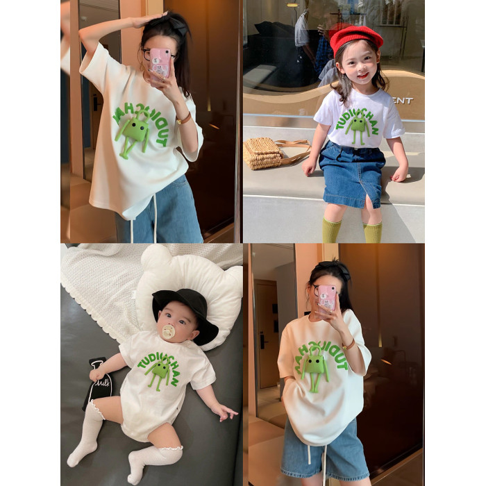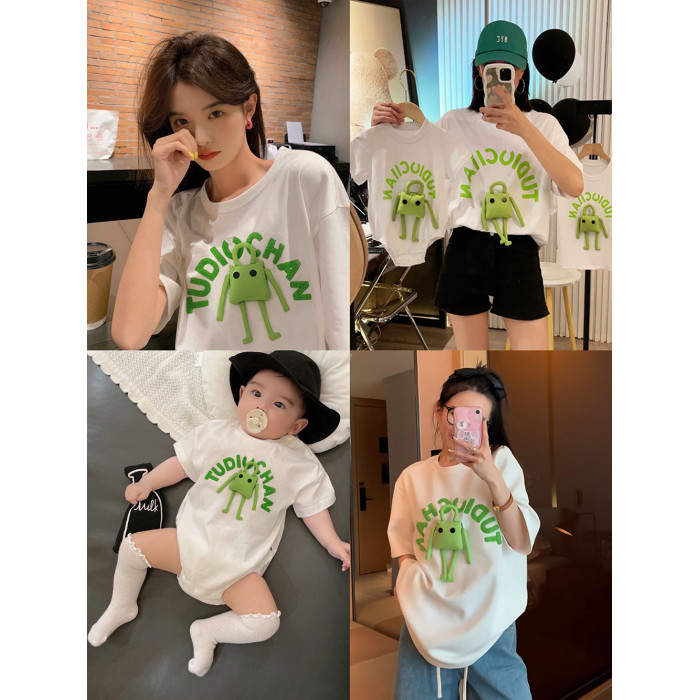 親子裝2025新款夏天一家三口母子母女裝嬰兒高級夏裝玩偶夏款T恤