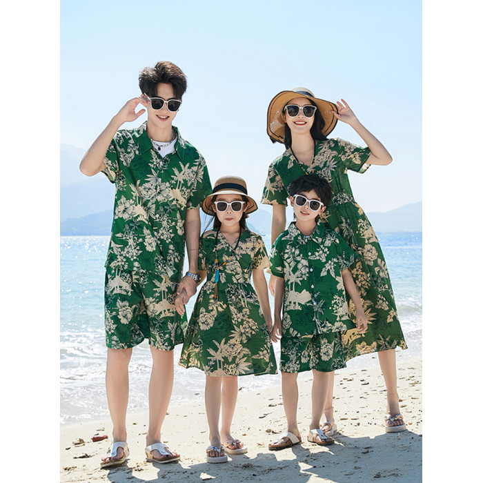 親子裝一家三口四口海南度假襯衣套裝夏季沙灘海邊母女連衣裙大碼