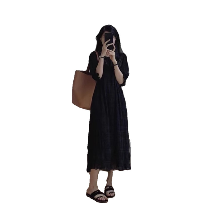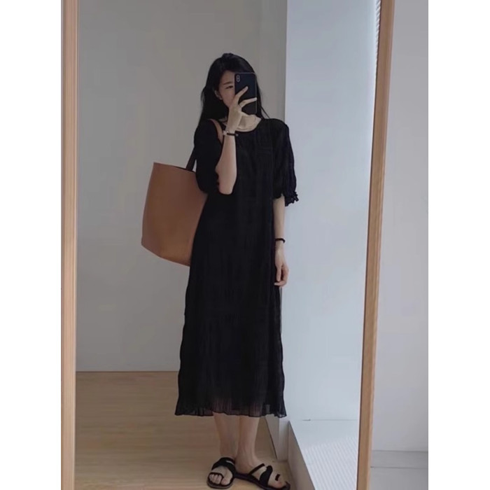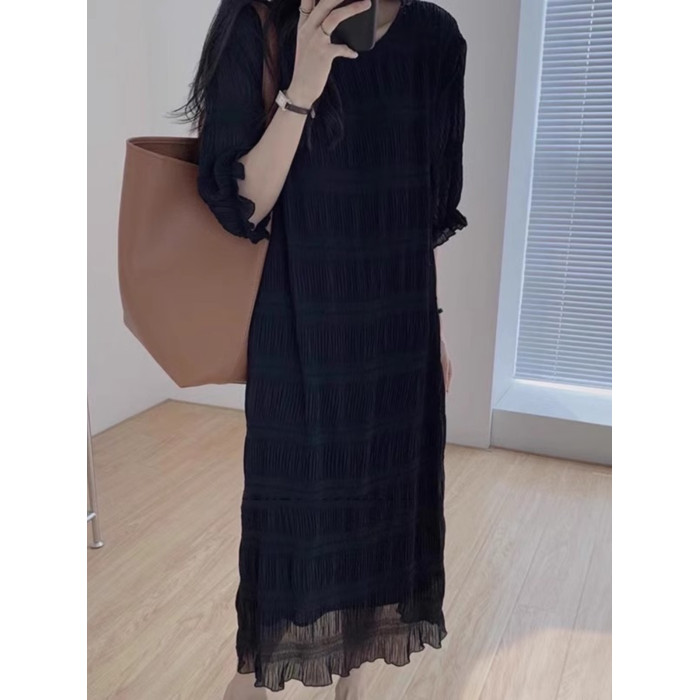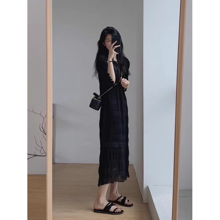 歐洲站2025夏季新款法式赫本風收腰顯瘦小衆設計感褶皺黑色連衣裙